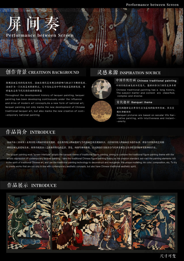 作品采用传统人物画中的宴饮题材,意在将传统人物画题材与当代漆画艺术表现形式相结合。以中国传统人物画画论为创作标准,将富含中国传统艺术精神的绘画元素提取出来,利用传统髹漆工艺将独具特色的造型、墨色、构图等解构重组,创作出既符合当代审美观念又具有中国传统审美精神的作品。
