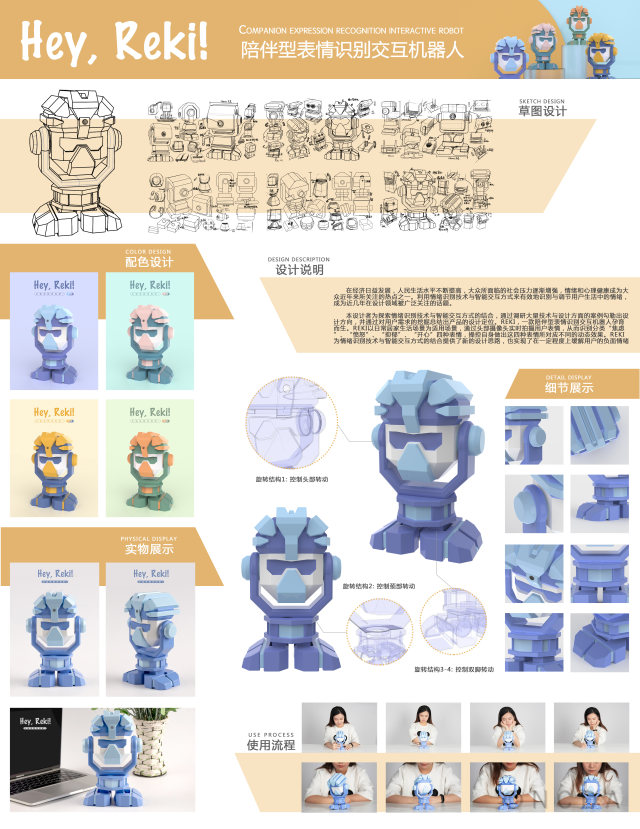 经济日益发展,人民生活水平不断提高,心理健康成为大众近年来关注的热点之一。利用情绪识别技术与智能交互方式来有效地识别与调节用户生活中的情绪,成为近几年在设计领域被广泛关注的话题。 设计者将探索情绪识别技术与智能交互方式相结合,通过调研大量技术与设计方面的案例勾勒出设计方向,并通过对用户需求的挖掘总结出产品的设计定位。Reki,一款陪伴型表情识别交互机器人应运而生。Reki以日常居家生活场景为适用场景,通过头部摄像头实时拍摄用户表情,识别“焦虑”“愤怒”“抑郁”“开心”四种表情,操控自身做出这四种表情所对应的不同动态效果。Reki为情绪识别技术与智能交互方式的结合提供了新的设计思路,也实现了在一定程度上缓解用户的负面情绪、为用户带来更好的交互体验的目标。