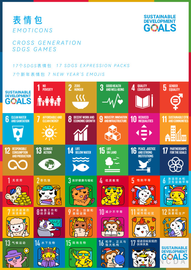 “联合国可持续发展目标表情包”在2022年新年期间推出,共有24张。其中17张对应联合国可持续发展目标,将联合国可持续发展目标与适合日常使用的表情进行转化和对应,更加符合使用习惯,并且方便对可持续发展目标进行记忆。还有7张新年福气表情包,适合在新年期间传递对亲朋好友的祝福,由十二生肖Q版动物形象为主题,具有中国传统文化特色,方便儿童认识小动物。