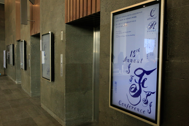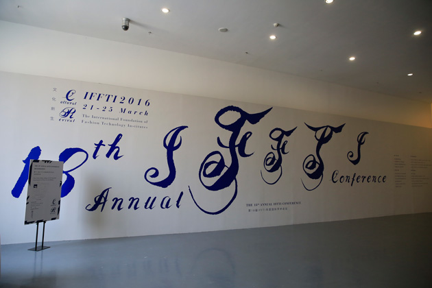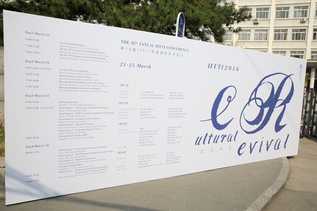 从8:30开始,IFFTI年会的现场注册工作有序进行,截至目前已有100多位世界各地的参会嘉宾到达北服,北服青年教师和学生志愿者一对一地接待各国专家学者。为了迎接此次国际学术盛会,北京服装学院校园内外布置了第十八届IFFTI年会的标志、主题板和欢迎电子屏,学校邀请艺术家设计的本届IFFTI年会书法体英文主题标志和系列视觉形象也以巨幅海报的形式树立在校园正门、北门和艺术楼内外,传递出端庄古雅又现代清新的视觉美感。艺术楼一层大厅布置了北京服装学院服装与服饰设计专业、箱包鞋品专业和珠宝首饰专业的师生作品,新颖的展示设计也令IFFTI参会嘉宾耳目一新。第18届IFFTI年度国际学术会议是IFFTI联盟与北京服装学院携手推动的国际学术和世界文化的一次面对面的接触与交流,体现了“文化新生”的主题内涵。