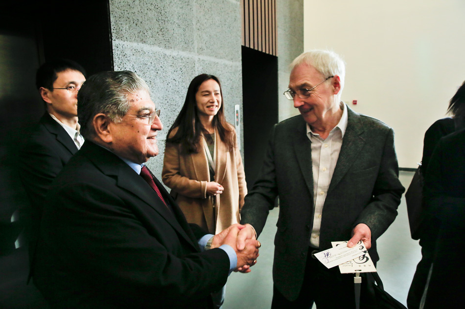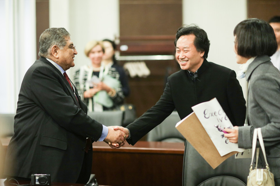 北京服装学院院长刘元风(右二)会见IFFTI秘书长Commodore Vijay Chaturvedi先生(左一)