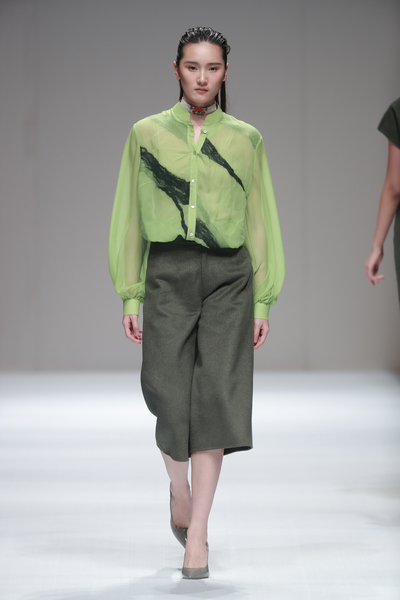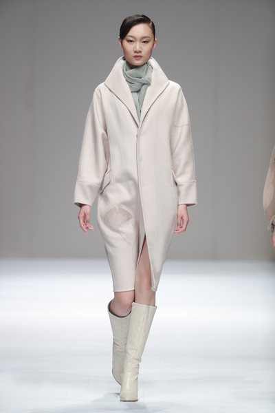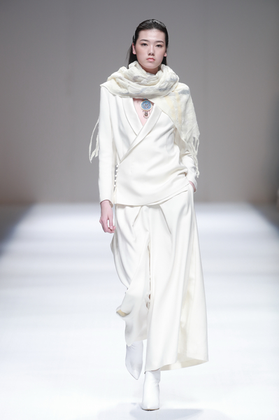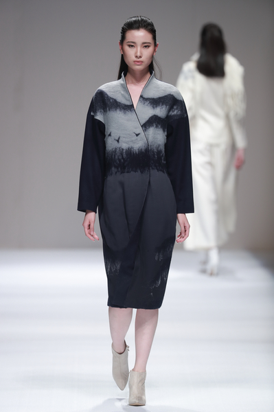 2016秋冬设计作品主题为“云汀”,词语本意是云气弥漫的水岸。设计灵感之一来自吴冠中先生中国水墨绘画的意境。设计师以水墨为蓝本,将独特的手工羊毛热缩工艺与大量的珠片钉绣有机结合,设计制作了独特的面料来表现水墨绘画的洒脱灵动,令作品呈现出淡雅悠远的超然意境。大自然给予设计师无穷的灵感来源,如水墨画般的自然景物更令设计师发挥无尽的想象力与创造力。手工艺是人类智慧的精华,是宝贵的艺术遗产。手工艺在服装设计中是提升服装品质的重要元素。设计师在本季大量采用手工羊毛编织、羊毛热缩以及手工钉锈,就是希望强化手工艺的现代意识,将手工艺术从传统形态向现代工艺推进,既保留手工艺的本质,又赋予其当代艺术的意义。