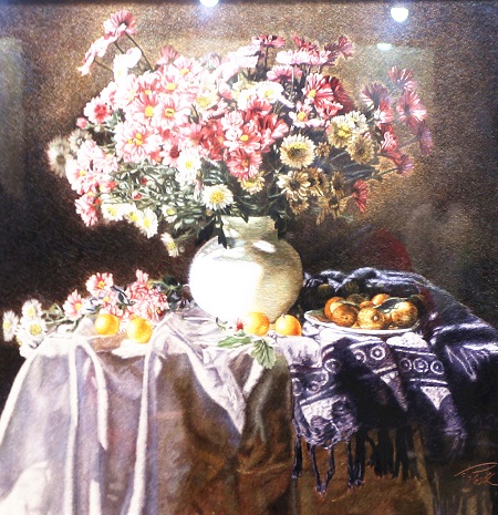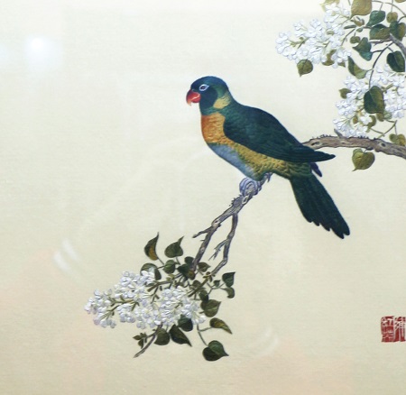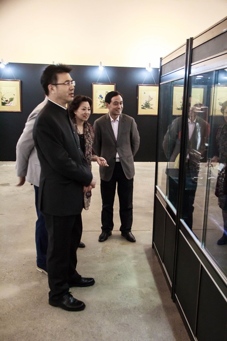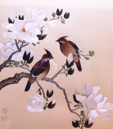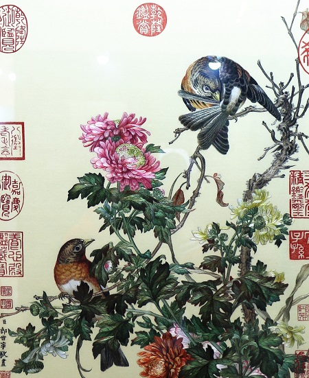 北京华益文化发展有限公司负责人,同时也是此次展品的收藏者韩加龙先生介绍:“作为我国传统名绣之首——苏绣,其最大特点可以总结为四个字‘精、细、雅、洁’,即‘精美’‘细腻’‘高雅’‘整洁’。其中‘细’是苏绣最为突出的特点,苏绣的‘细腻’主要体现在它的配色和丝线方面,比如说此次展览中三幅黑白观音的苏绣,看上去颜色简单,可实际上其中包含了许多不同层次的黑色灰色。其中的丝线,最细的可以达到一根正常丝线的十六分之一甚至三十二分之一,一针一线全部都是纯手工缝制而成,像这一类的苏绣都是属于国宝级的珍品。”