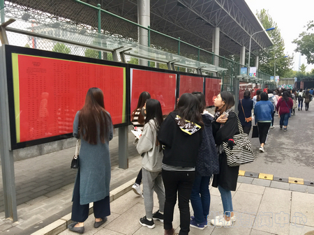 10月20日下午,同学们随着下课的铃声走出教学楼,在张榜过程中同学们不时驻足在红色的公示栏前,从7371个人名中寻找核对自己的名字。