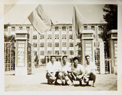郭英、朱志贤、何建华、郭玉周等教师在革委会校牌前留影同年,学校招收的第二届八个班学生和全校教职工一起搬到了定福庄新校区上课。说是新校区,其实操场、暖气管道、锅炉房等基础设施都尚未动工,学校看上去还是一片工地景象,大风一刮,校园里便尘土飞扬了。但令师生们高兴的是,学校终于有了属于自己的教学楼、宿舍楼,还有了专门的食堂。来到新校区,困难接踵而至。何老师告诉记者,第一大困难就是吃不饱,粮食和蔬菜供应紧张。刚入冬时,学校食堂主管就开车拉着一大群师生去农村菜地里捡农户们剩下的白菜帮子。当时粮食也短缺,主食要定量,经过学校领导集体商议,秉持不能让学生饿着肚子上课的原则,学校规定学生的定量不能低于每月35斤,这比何老师当时的定量还要多7斤。除了吃不饱,建校时面临的第二个困难是入冬后没有暖气。何老师回忆当时给三个班上大课时,为了取暖就在教室前面摆了一个一米半高的大煤炉。一节课下来,教室里已是烟雾缭绕,气味呛人,坐在后排的同学还是不免要冻手冻脚。宿舍的每层楼道里也摆着大煤炉,但收效甚微。在如此艰苦的条件下,全校师生没有一个人生出退却之心,教师认真教,学生认真学,一起携手渡过了学校初创时最困难的几年。1961 年,学校还面临教学任务调整的难题。为满足化学纤维工业发展的需要,纺织工业部决定把学校性质转变为以化学合成纤维生产加工专业为主,专门培养化学纤维、纺织化学工程技术人才的院校,学校也因此更名为北京化学纤维工学院。这一变动给学校的教学系统造成了不小的冲击,也给同学们的学业增加了难度。但这种种困难并未浇灭全校师生的学习热情,他们都积极调整授课和学习的重点,一心只想为国家的化纤事业贡献力量。“也没有气馁,反而觉得充满希望”,何老师忆起当年时仍然壮心不已。