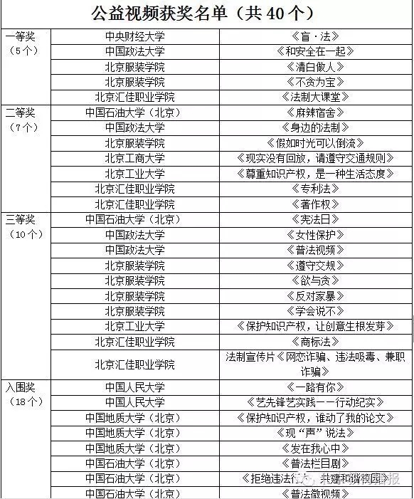 活动在全场诵读《宪法》声中拉开序幕。来自中央财经大学的周远洋同学和东城区东城区和平里九小蔡闰羽同学进行了宪法主题演讲。活动现场对第四届北京高校普法微视频作品征集展映活动中的的优秀作品及单位进行表彰。此次活动共收到28所学校提交的130部作品,其中微电影作品90部,公益视频作品40部,作品数量与往年相比大幅增加,作品质量也有较大提升。我校积极组织学生参与,作品融合专业性和思想性,体现了北服学子对社会问题的关注与思考。我校共申报普法类微视频16部,动画14部。在微电影类评比中,《一支钢笔》获得一等奖,《杀人回忆》、《不忘初心》获二等奖,《枪手记》、《母亲》获三等奖;在公益视频类评比中,《清白做人》、《不贪为宝》获得一等奖,《假如时光可以倒流》获二等奖,《遵守交规》、《欲与贪》、《反对家暴》、《学会说不》获三等奖。另有多部作品获得入围奖。北京服装学院获得了优秀组织奖。