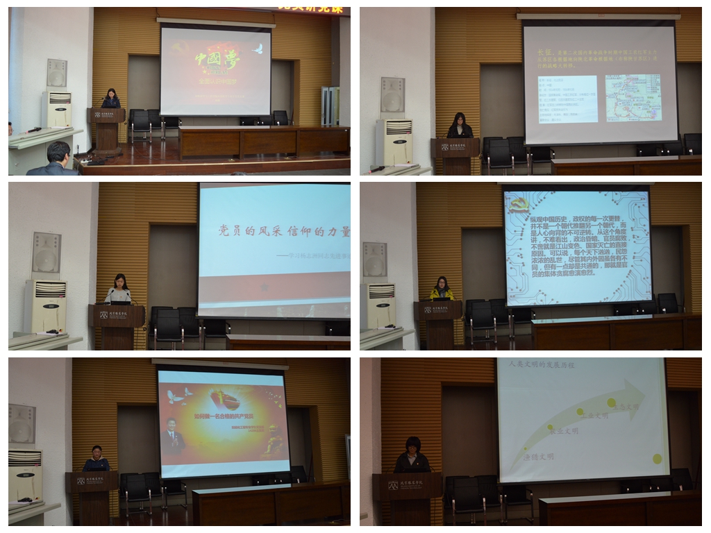 交流活动中,办公室党支部的陈森老师从群众路线的孕育产生到发展成熟,以及在我党历史上的3次系统总结为全体党员讲解了群众路线的由来。应用化学教研室党支部的鲍利红老师走上讲台,结合2004年感动中国人物徐本禹的事迹,从教师爱岗敬业的角度为大家讲解《榜样的力量》。基础化学教研室党支部的何璞祯老师结合“两学一做”学习教育的总体学习要求,以及本支部的具体实施情况,从锤炼党性修养、坚定理想信,刻苦钻研本领、踏实工作尽责念,严格遵纪守法、为人师表立行三个方面,与大家分享了学习心得。高分子材料与工程教研室党支部的董振峰老师从基层科研工作者角度,阐述了科技创新学习的关系,从行业科技前沿石墨烯的发现应用到国防武器装备中的高科技产品,无不说明创新的重要,彰显了科研工作者不忘初心,时时处处发挥不怕苦不拍累的拼搏钻研精神。轻化工程教研党支部王晓春老师从建国以来在我党的领导下祖国在政治、经济、军事、科技等方面取得的丰功伟绩,老百姓衣食住行的变化入手,结合专业畅谈教师党员热爱本职工作、热爱党的教育事业应该怎样做,怎样发挥作用,以及深刻体现在“两学一做”学习教育中学做并重的重要性。应用化学专业学生党支部的郭美娇和杨歌同学分别做了《走好我们今天的长征路》和《全面认识中国梦》的党课汇报,高分子材料与工程专业学生党支部的刘同慧和邓亦锐同学分别做了《反腐倡廉》和《党员的风采信仰的力量》的党课汇报,轻化工程专业学生党支部的王笑笑和衣荟洁同学分别做了题为《做一名合格的共产党员》和《大力推进生态文明建设》的党课汇报。