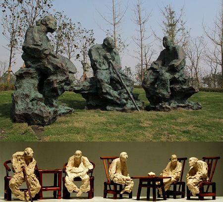 作品把人物年龄定位在71岁,即朱载堉完成《乐律全书》的年龄。人物身着长衫,头包小包帕,腰系大带,体现其“布衣王子”高风亮节的形象特征。雕塑中采用人物弹琴过程中左手飞燕颉颃、右手春莺出谷的经典古琴手势,展现了人物闭目仰头的一瞬间。其弹奏的乐器正是他制造的第一架定音乐器——“均准”。雕塑创作以深远、空寂为造型基调,在雕塑的空间里形成平远之感,表达了时空深远、诗意无限、大音希声、怡淡浩然的抽象感受。雕塑底座是朱载堉创建的“十二平均律”所付诸的旋宫实践,即乐律的“旋宫图”,呈圆状。这个圆也是中国文化中一个重要的精神外化,一种圆融的生命境界,一种浩瀚的宇宙意识,一种人与自然和谐中的诗性塑造和哲学思考。雕塑意在展现人物独特的人文精神,以及超越于形体与材质之上的人文情怀。