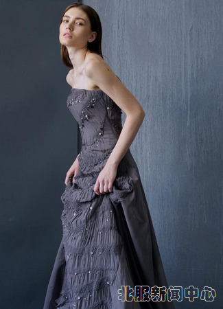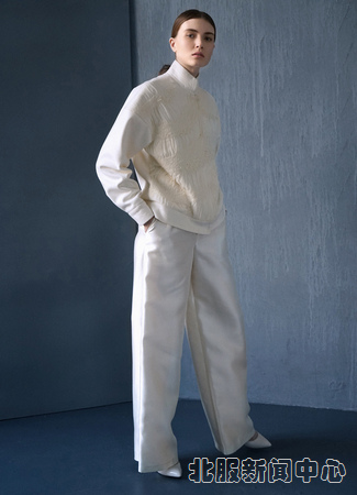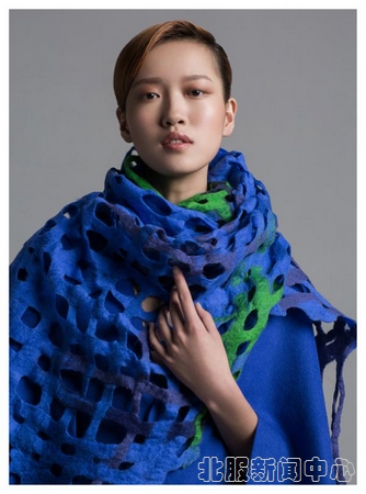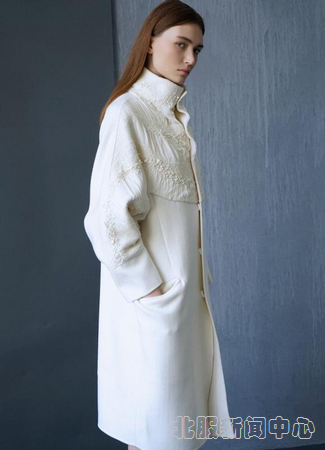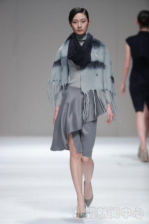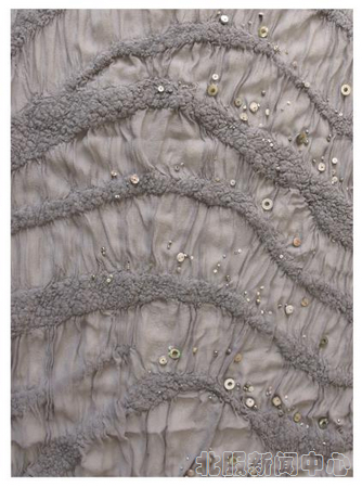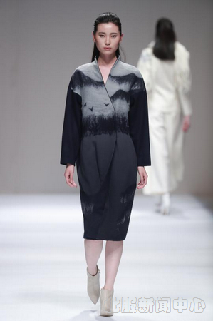 再如2016秋冬的设计系列,作品主题是“云汀”,词语本意是云气弥漫的水岸。设计灵感来自吴冠中先生的水墨绘画,将独特的手工羊毛热缩工艺与大量的珠片钉绣有机结合,设计制作独特的面料,令作品呈现出淡雅悠远的超然意境。大自然给予设计师无穷的灵感来源,水墨画般的自然景物更令设计师发挥无尽的想象力与创造力。手工艺是人类智慧的精华,是宝贵的艺术遗产,在服装设计中是提升服装品质的重要元素。孙老师在这一季大量采用手工羊毛编织、羊毛热缩以及手工钉锈,就是希望强化手工艺的现代意识,将手工艺术从传统形态向现代工艺推进,既保留手工艺的本质,又赋予其当代艺术的意义。