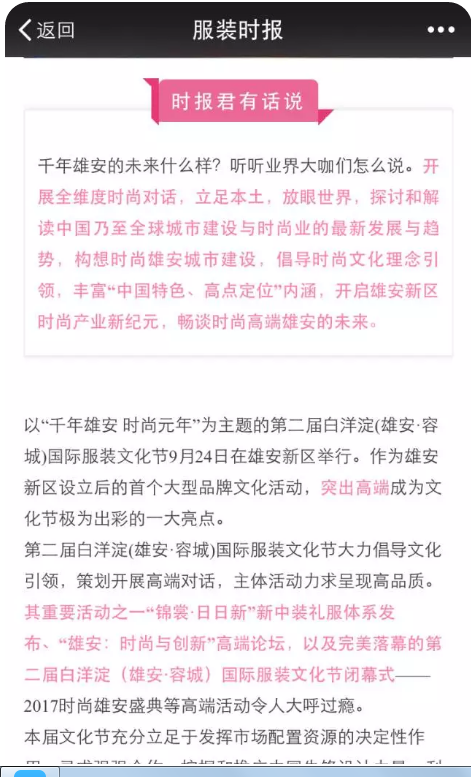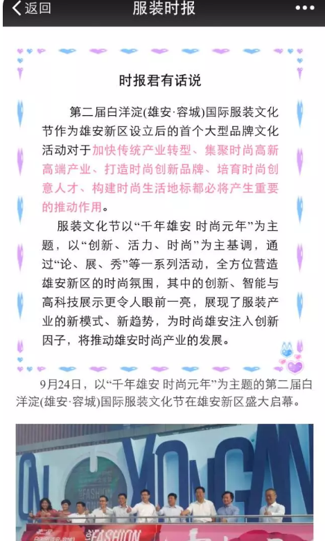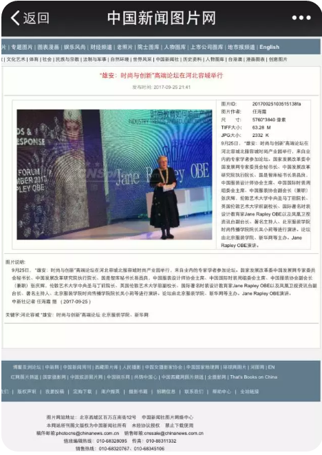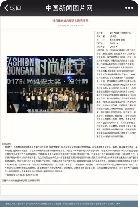 千年雄安,时尚元年。9月24日至 26日,第二届白洋淀(雄安·容城)国际服装文化节在雄安新区容城体育馆、北京服装学院容城时尚产业园等地举办。此次服装文化节以“千年雄安 时尚元年”为主题,由北京服装学院、新华网、雄安新区容城县人民政府主办,华润(集团)有限公司联合主办,中关村北服时尚产业创新园、北京服装学院容城时尚产业园承办。活动期间,学校新闻中心邀请中央电视台、北京电视台、中国新闻社、北京日报、北京晚报、中国纺织杂志、服装时报等多家媒体,赴容城进行现场报道,全方位地呈现第七届首都大学生创意集市、时尚·科技·艺术展、传习手工沙龙、2017年国际青年设计师邀请赛、“锦裳·日日新”新中装礼服体系发布、“雄安:时尚与创新”高端论坛、时尚雄安盛典颁奖礼等活动盛况。