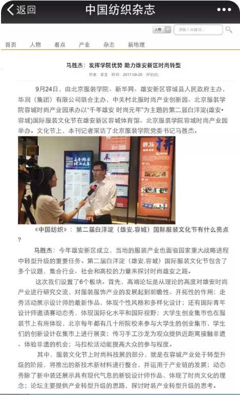 在接受北京电视台记者采访时,马书记在谈到北服与容城开展的合作时说:2015年以来,容城县人民政府与北京服装学院共同举办了首届服装文化节,先后成立了“北京服装学院白洋淀服装文化创意中心”“北京服装学院中小学学生装(校服)研究中心成果转化基地”“北京服装学院容城时尚产业园”以及“北京服装学院服装艺术与工程学院校外实践基地”等,这些机构和基地的成立和建设,对加快容城服装产业从服装制造到时尚产业、从定制中心到设计中心、从一般消费到现代生活方式研究的转型升级起到积极的促进作用。