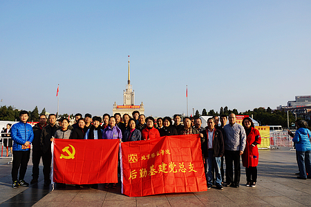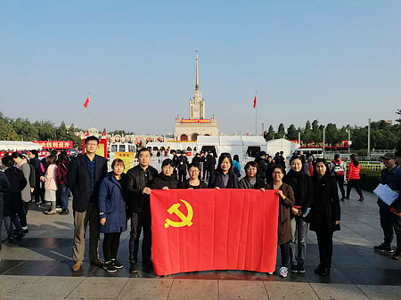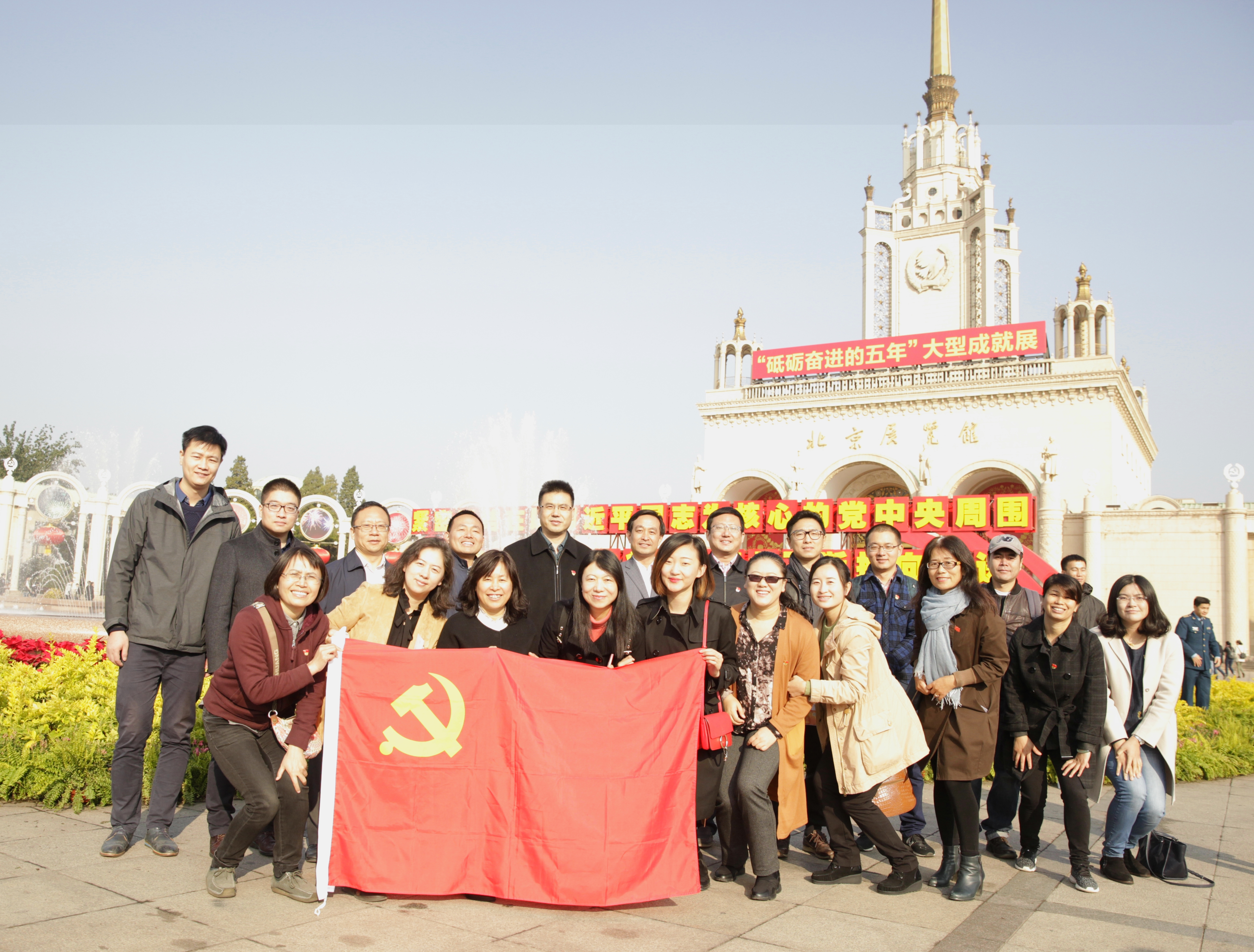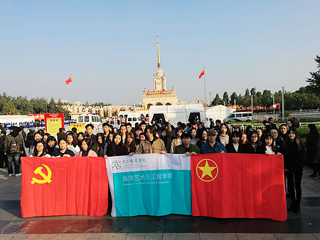 十月的北京碧空万里,展馆门前花团锦簇。北服师生们怀着无比激动的心情,纷纷在展馆门前合影留念。