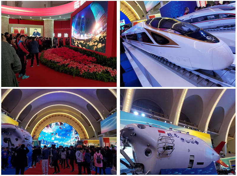 《“砥砺奋进的五年”大型成就展》全面宣传展示了党的十八大以来党和国家的历史性变革。进入展厅,大面积运用的中国红首先映入眼帘,给人以庄严振奋之感。南水北调工程、复兴号动车、蛟龙探海、大型民机未来智能驾驶、“天眼”探空、“神威太湖之光”超级计算机、胶囊胃镜机器人……一件件高科技的展品,一段段珍贵的视频资料,一幅幅精美的照片,无不吸引着北服师生的目光。大家不时驻足观看,认真听取讲解员讲解,相互交流观展感受,并为祖国在各领域取得的非凡成就感到无比自豪。