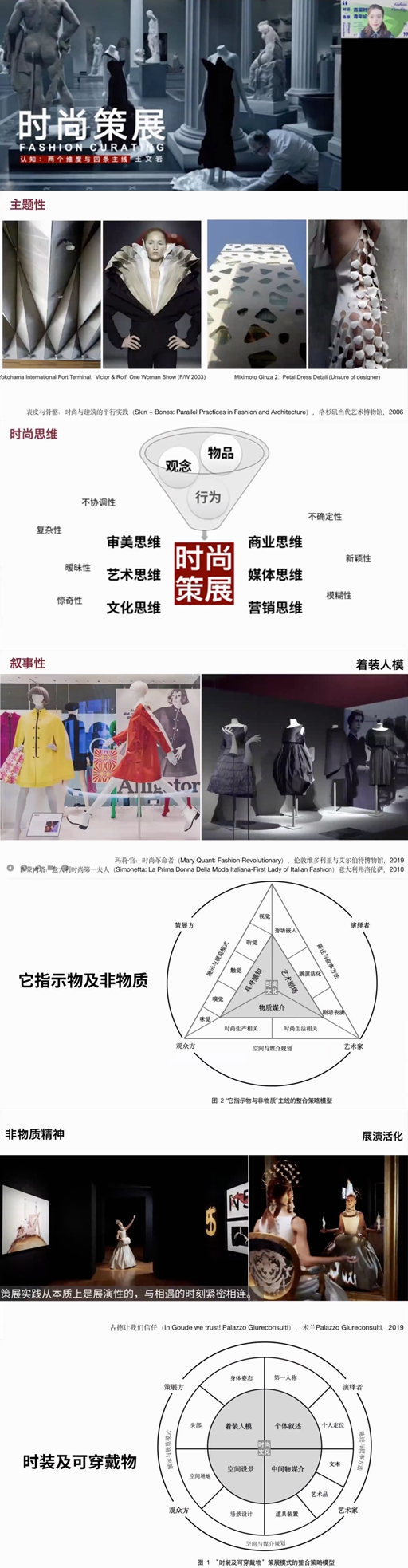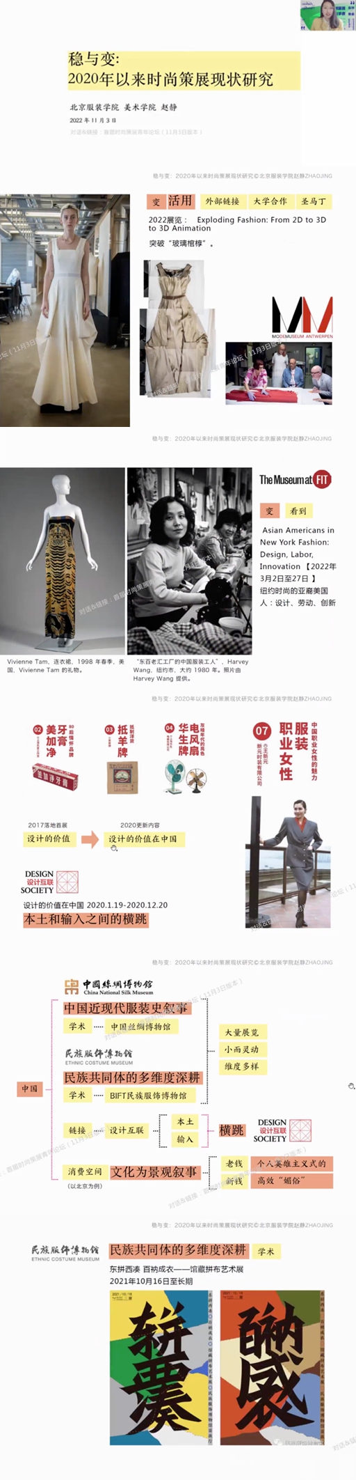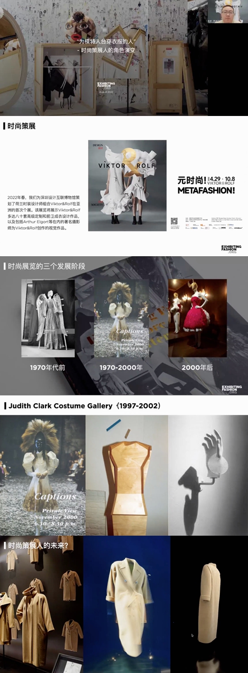 最后一位演讲者是北京服装学院美术学院副教授赵静,发表了《稳与变:疫情以来(2020-)时尚策展现状研究》的主题演讲,她从全球博物馆的时尚策展案例的类型分析切入,表达了她对于展览案例在文化视域下的观察;分析了作为全球时尚资源的一种调度与管理方式,时尚策展如何成为文化叙事的方式之一;对比了博物馆与商场中的时尚文化表达有何不同?以及在内容的在地和资源的求变中,博物馆又可以多大程度上在“稳”与“变”中博弈。