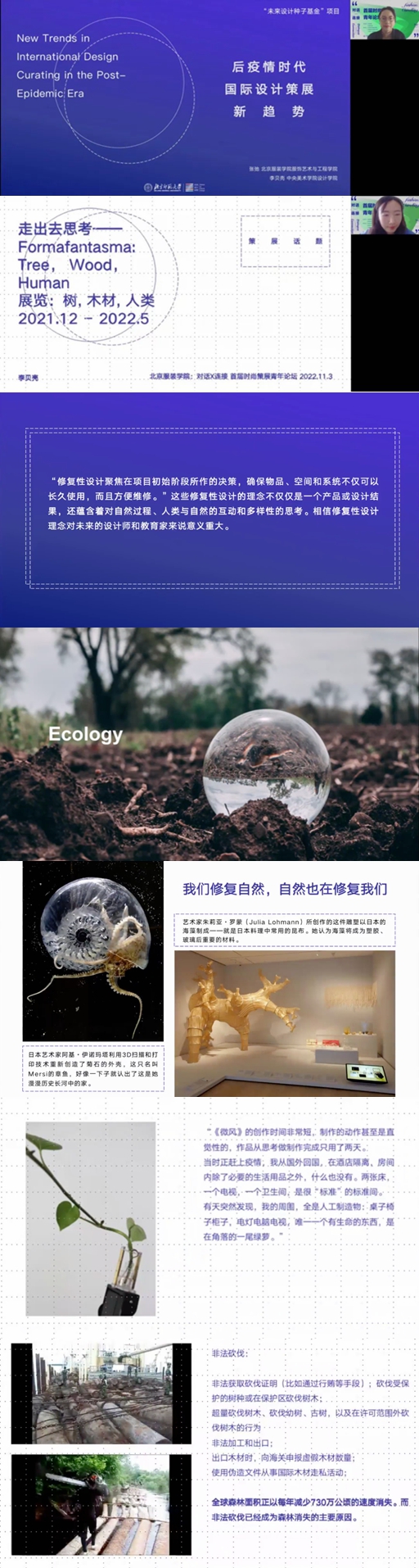 第二个演讲主题是《后疫情时代国际设计策展新趋势》,由北京服装学院服饰艺术与工程学院助理教授张弛和中央美术学院设计学院设计策展方向教师李贝壳共同完成。她们以共同合作的研究成果为基础展开,通过聚焦海外知名设计博物馆最近三年以来的主要展览,讨论了在博物馆的语境之下,后疫情时代的设计与设计策展所产生的新变化,并反思当代设计在后疫情时代应承担的角色及责任。