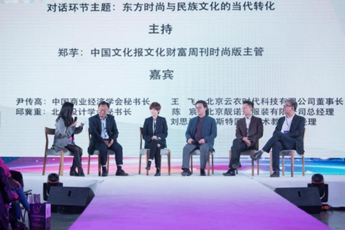 在高端对话互动环节,中国文化报文化财富周刊时尚版主管郑芋,中国商业经济学会秘书长尹传高,北京云衣时代科技有限公司董事长王飞,北京设计学会秘书长邱冀重,北京靓诺派服装有限公司总经理陈宸,弗斯特国际艺术教育总经理刘思洋五位嘉宾就“东方时尚与民族文化的当代转化”展开了可深入的探讨。