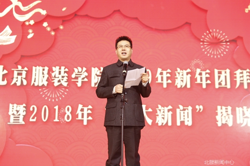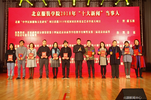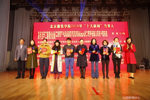 随后,《2018年“十大新闻”》揭晓视频的播放,发布了一年一度的“十大新闻”评选结果。2018年我校大事多,社会影响大。12月初,党委宣传部将一年来发表在官网和校报上的近600则新闻,按照十大新闻的要求初选形成42条新闻题目作为投票范围,进行了纸质选票以及官网、官微在线投票相结合的投票,广大师生积极参与,最终评选出(按新闻时间顺序排序):一、作为中英高级别人文交流机制第五次会议的重要内容之一,北京服装学院与英国王储传统艺术学院、敦煌研究院、敦煌文化弘扬基金会在英国伦敦签署“敦煌服饰文化研究暨创新设计中心”战略合作框架协议,"敦煌服饰文化研究暨创新设计中心"挂牌并举办“绝色敦煌之夜”服饰设计展演;二、北京服装学院学报艺术版《艺术设计研究》首次进入CSSCI来源期刊目录;三、我校被教育部授予“全国高校实践育人创新创业基地”称号;四、楚艳、周绍恩老师服装设计团队成功设计平昌冬奥会“北京8分钟”表演服装,团队荣获2018年北京市工人先锋号称号;五、北服两名校友登上福布斯2018亚洲30位30岁以下精英榜(林海、高雪);六、陈静获第二十届OFF FASHION 国际青年服装设计师大赛一等奖,三名学生(李思杰、金璐菲、彭望望)包揽首届美国 ETFashion Global Design Awards全球时装设计大赛配饰组金、银、铜奖;七、北服“中华民族服饰文化研究”项目获批2018年度国家社科基金艺术学重大项目;八、詹凯教授、姜延副教授分别荣获第十四届北京市高等学校教学名师奖及第二届北京市高等学校青年教学名师奖;九、北服参与“伟大的变革——庆祝改革开放40周年大型展览”之“改革开放40周年群众服装变化”展区工作;十、艺术设计学院环境设计系教师党支部获首批参与培育创建“全国党建工作样板支部”殊荣,艺术设计学院环境艺术设计专业学生党支部在北京高校红色“1+1”示范活动评选中荣获一等奖。