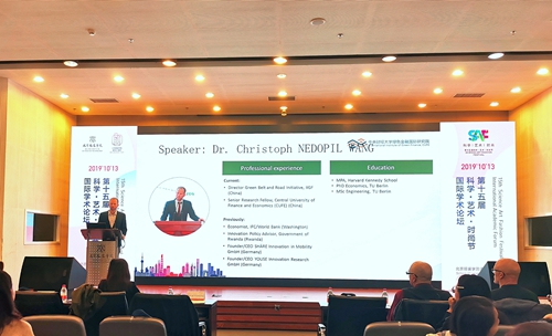在上午的交流中,中央财经大学绿色金融国际高级研究院高级研究员Christoph Nedopil Wang博士首先发言,他以“服装和可持续一带一路”为题,为在场观众介绍了气候变化及环境保护、可持续与创新发展、中国政府在绿色金融方面付诸的努力等精彩内容。师生们专注聆听,报告厅掌声阵阵。