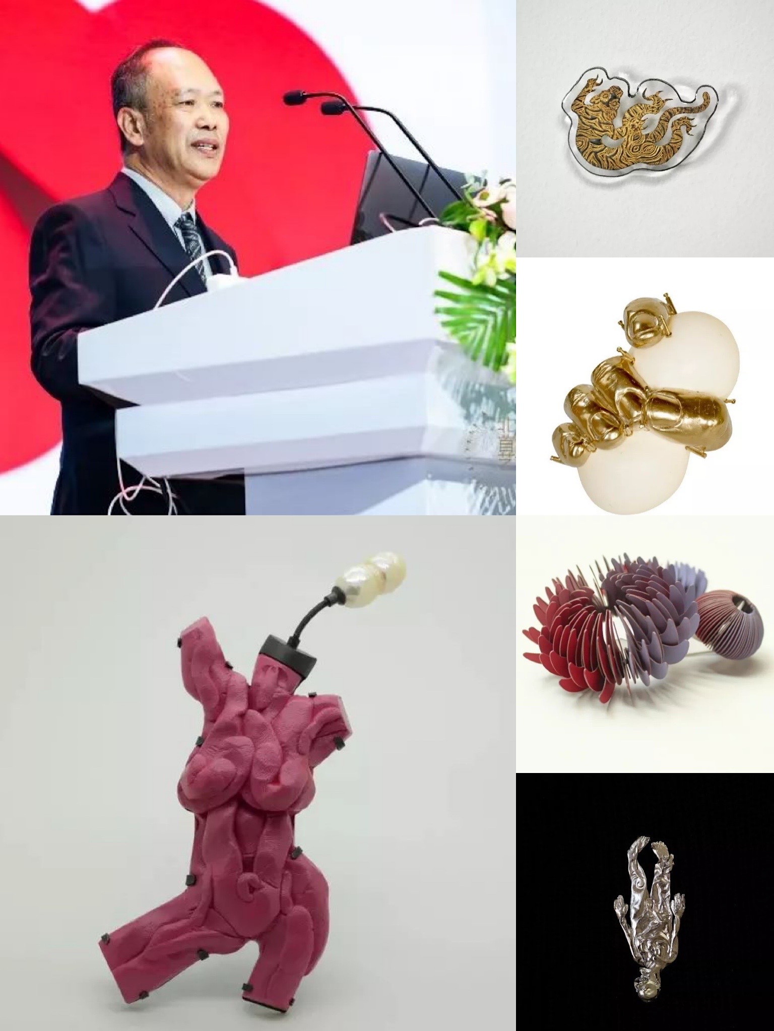 东京艺术大学副教授岩田广己 (HIROKI IWATA)进行了以《日本现代首饰及其背景》为主题的演讲,他向我们介绍了关于日本现代首饰及其历史背景的相关知识。对于岩田教授来讲,学生时代所见的自然之景和一些印象深刻的事情是他的灵感来源之一。他认为自然给予我们存在的价值,而近年来自然被人为破坏严重,应当给人们敲醒警钟,所以他的作品针对自然探索的方面进行表现。他提出,人应该像植物一样吸收各种各样的营养进行成长,要有意识的形成自己的风格。除此之外,表达消极的情绪也是他作品中的一部分。