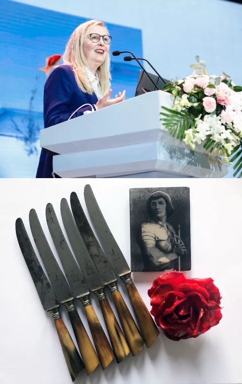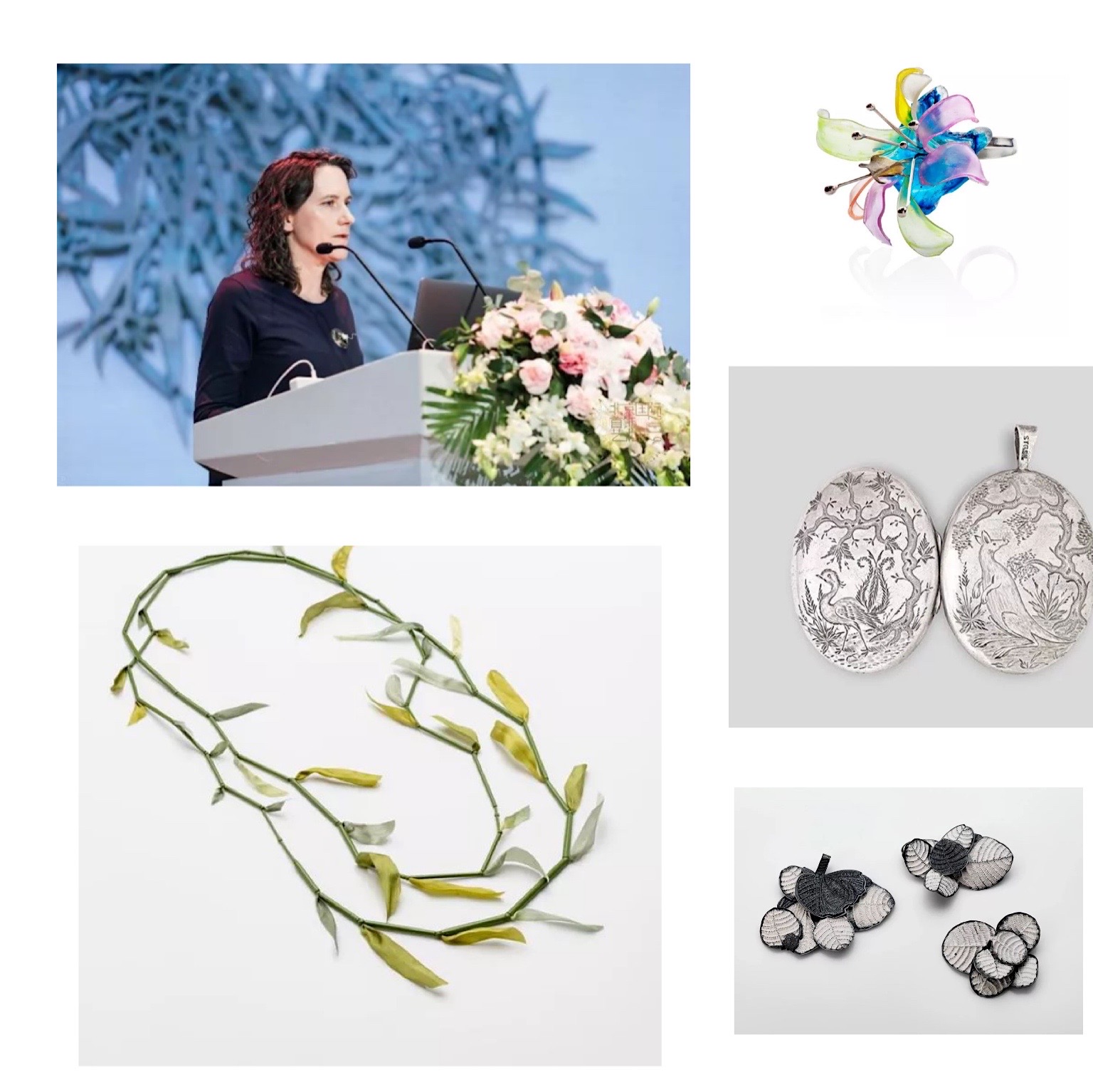 英国伯明翰城市大学珠宝学院教授Jivan Astfalck 谈到《嫁接的故事》。她说,她谈到在叙述性珠宝的背景之下,需要谈论“隐喻”这个概念,认为没有它的话人们就不能更加深入地理解叙述性珠宝。她以自己的作品《钢铁意志和玫瑰》为例深入浅出地分析了多种叙事方法,包括:集合——通过将发现的和通常无关的对象组合在一起而制成的艺术品;分层隐喻——从直接的比喻到高度隐喻的和诗意的;实质性象征主义——使用象征来代表思想或品质;自传式民族志——使用自我反思来探索轶事和个人经历,并将这个自传故事与更广泛的文化、政治和社会意义和理解联系起来;浪漫的乌托邦——以理想的现实观点为特征或暗示这种现实的观点;梦想着一个完美的世界,一个没有冲突、饥饿和不幸的世界。