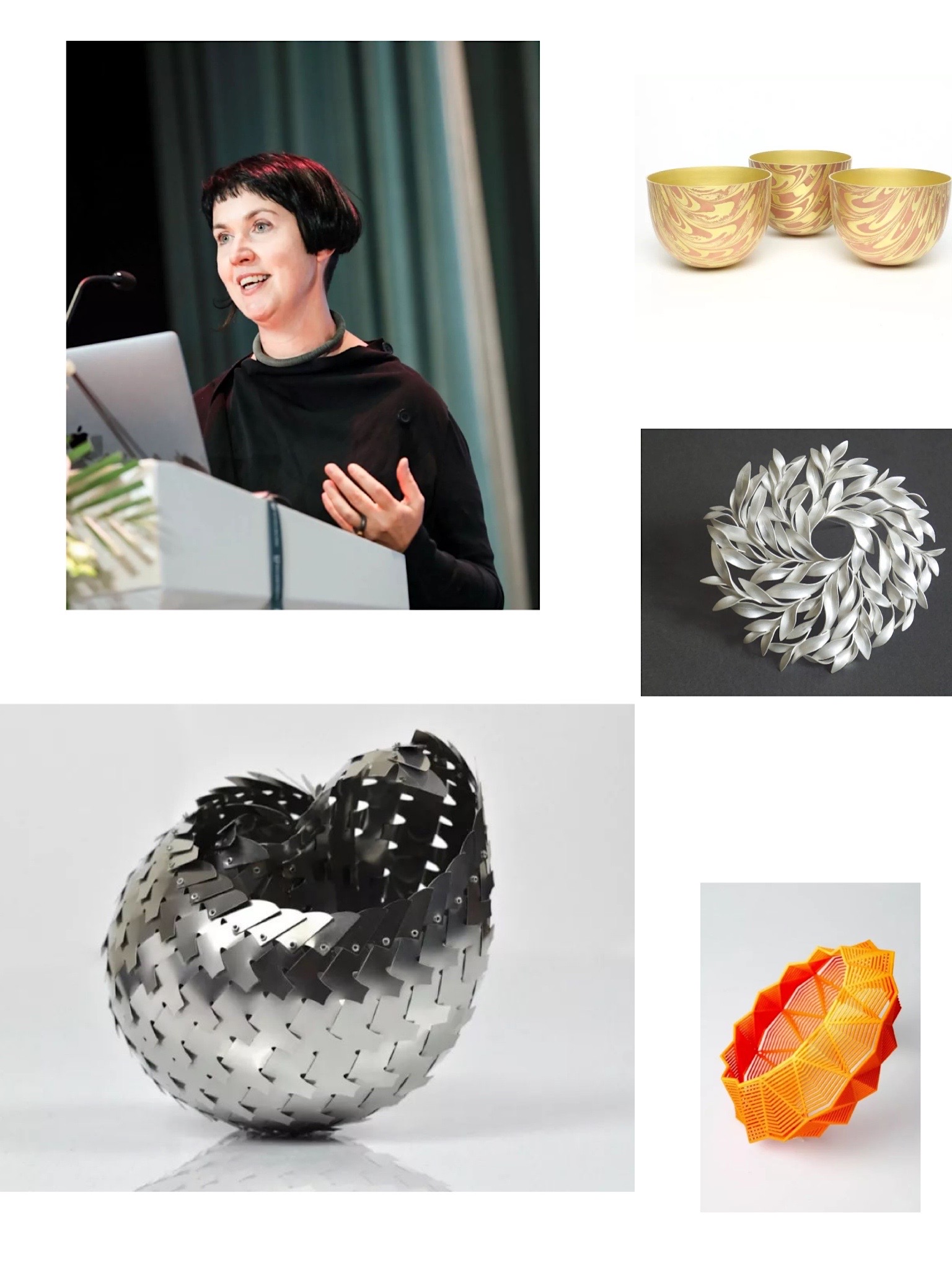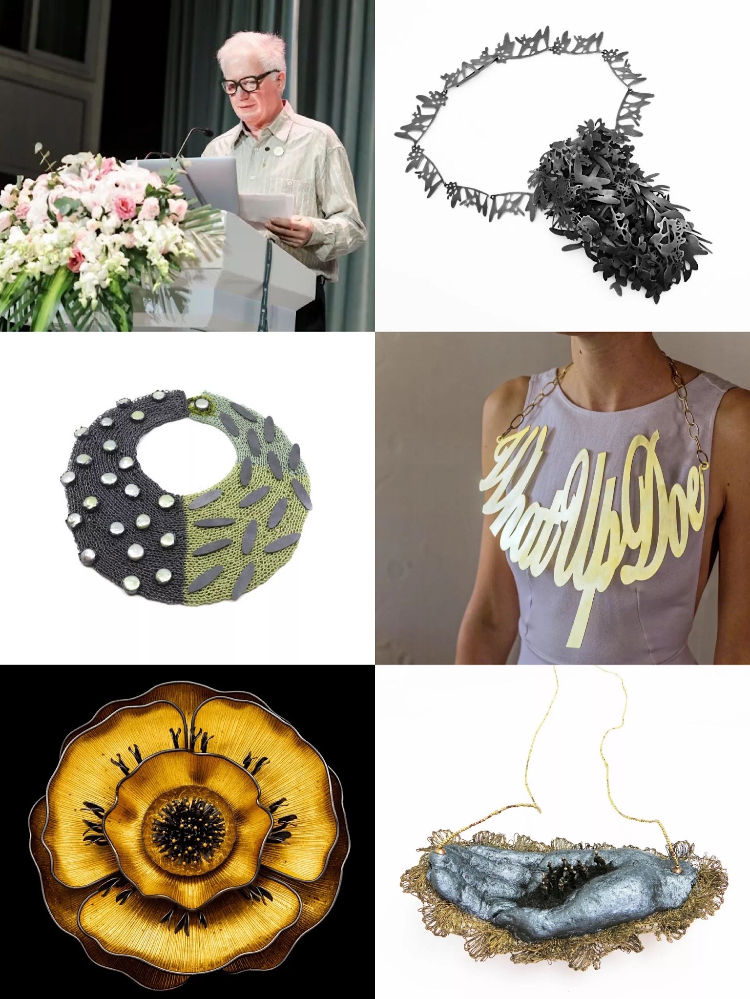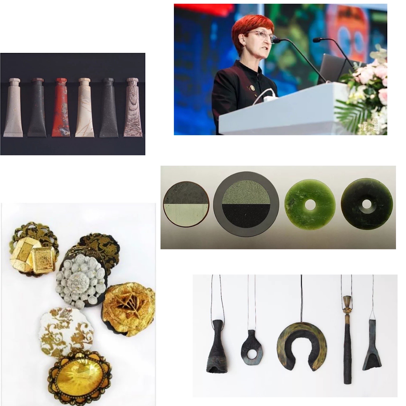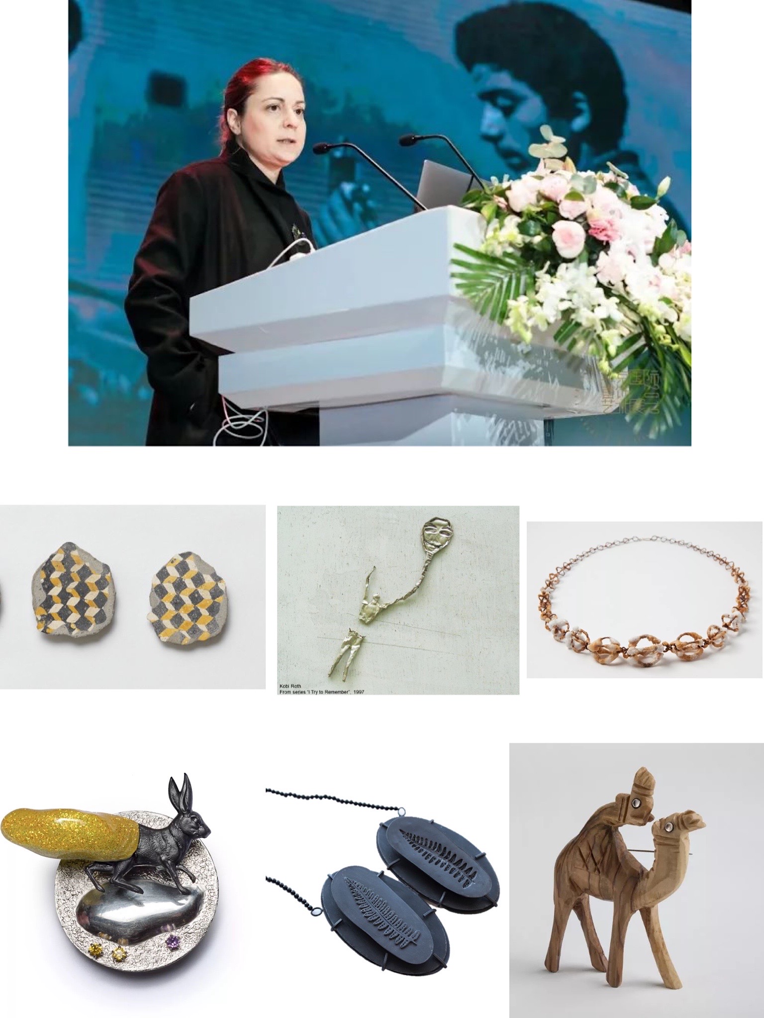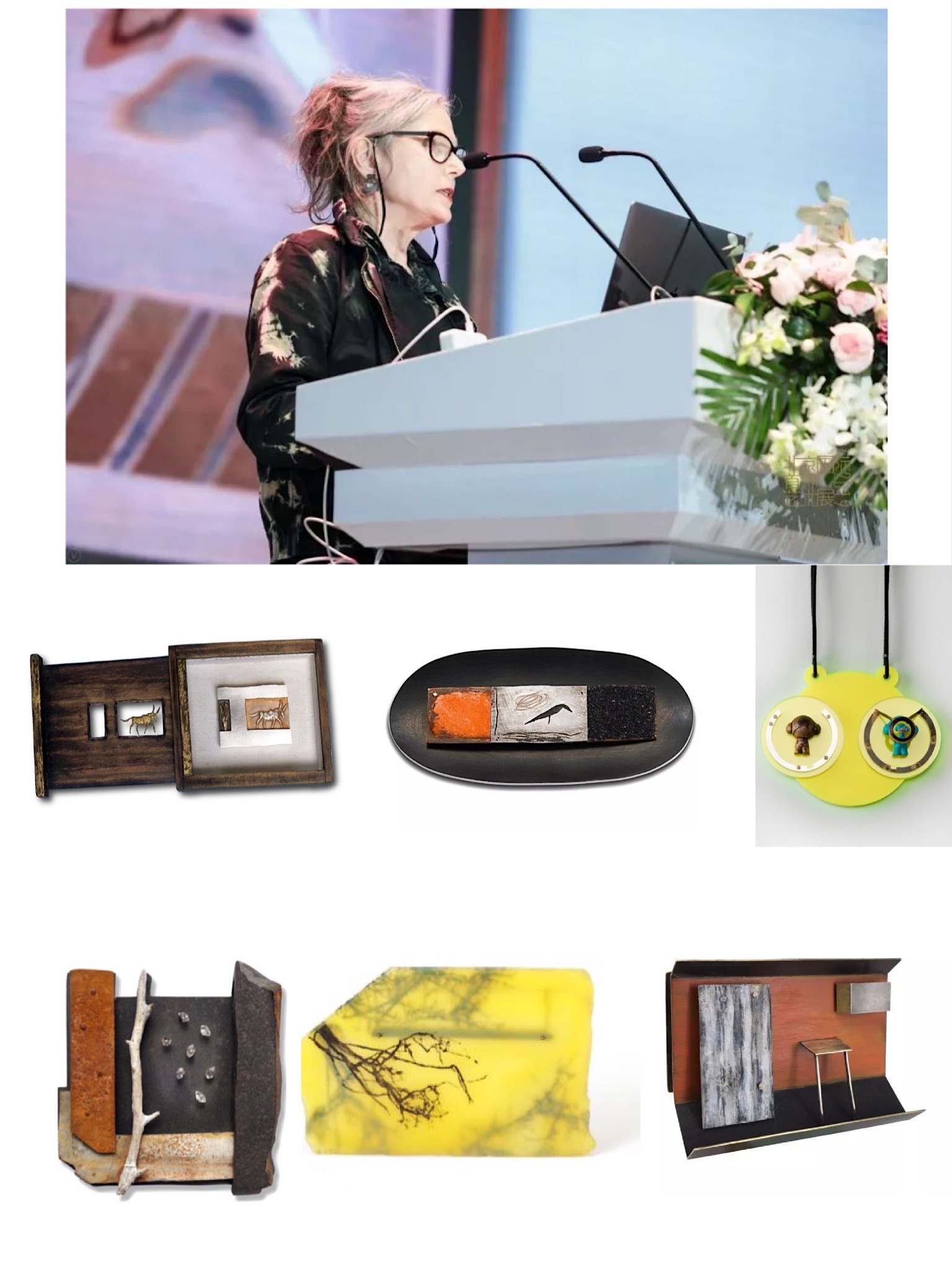 新西兰特奥哈创意学院首饰系教授Fiona Christeller发表了《奥特亚罗瓦(新西兰)的当代首饰艺术—反思》的演讲。主要谈及两部分,首饰以及学生教育。在首饰方面,她主张追逐新的理念,作品大致可分为三类。第一类以新西兰的自然景观为灵感,注重环保,以自然为主题,使用如种子,小石块等材料。第二类关注人的栖息地,将自然材料和现代社会相结合,体现人性。第三类体现社会思想和当代社会的反思和思考,关注环境,注重废物的回收利用。在教育方面,她鼓励学生和不同的创作者合作,用不用的材料和技法制作首饰。她的教育理念是不要过多干涉学生的想法,希望学生学习不同的技法,如摄影、绘画等来辅助进行创作。