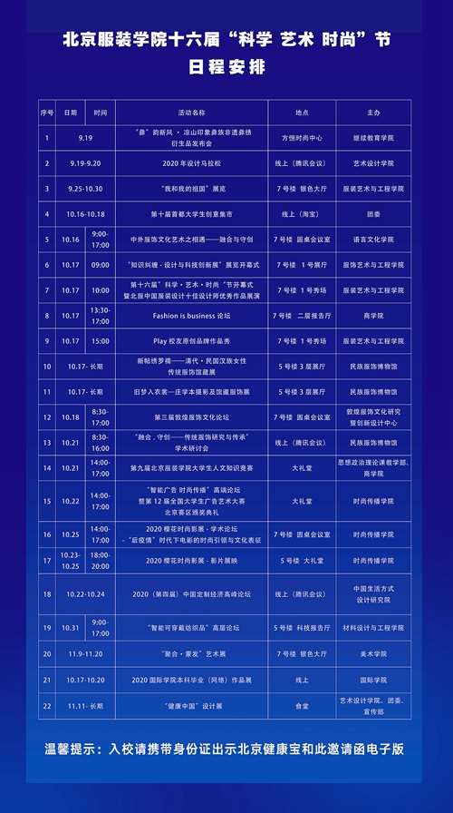 北京服装学院2020年第十六届“科学·艺术·时尚”节定于10月17日(星期六)上午举行开幕式。