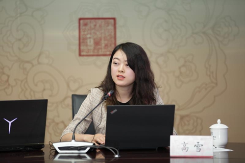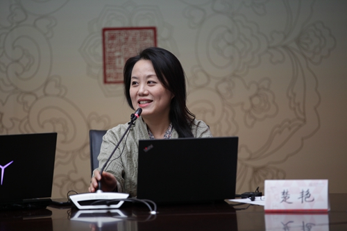 高雪助理馆员做了题为《敦煌莫高窟壁画与敦煌丝绸中的菱形装饰纹样比较探析》的专题讲座。装饰历史悠久的菱格纹,常于器物、绘画、染织等多种载体上作装饰纹样,在敦煌莫高窟菱纹以丝织物和壁画为重要表现媒介,因其几何构成形式灵活性强,使得图案结构富于变化,为探索菱纹在敦煌历代装饰图案中生生不息的原因,并立足当下从基本构成的视角探寻图案构成的更多可能性。高雪助理馆员根据对敦煌莫高窟菱纹的考察,主要从两个方面对其进行比较探析:一是梳理敦煌历代建筑装饰图案中菱纹的发展演变,探寻纹样形态构成规律;二是选取莫高窟壁画中有代表性的佛菩萨人物服饰图案,提取其中的菱纹与敦煌出土丝绸织物上的菱纹作横向的比较分析。