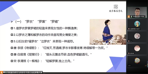 汉魏六朝时期作为我国古代诗歌的逐渐成熟的重要时期,诗歌中有大量描写服饰形象的意象,演讲以该时期诗歌中出现的“罗衣”“长袖”等意象为例进行分析,对其流变做出了论述。演讲指出衣冠服饰作为一种重要文化载体,反映了各历史阶段的生活形态,并在文学创作中占据重要地位。中国传统服饰文化促进了文学艺术的发展,同时丰富的中国古代文学遗产为我们研究、了解古代服饰发展史提供了重要佐证。