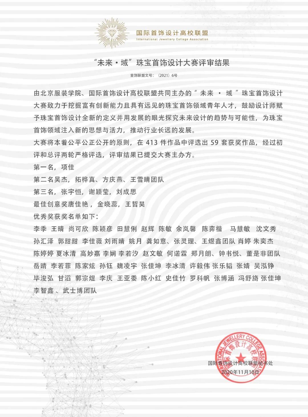 本次活动同期举行了“未来·域”首饰设计全球竞赛及颁奖礼。“未来·域”珠宝首饰设计大赛由国际首饰设计高校联盟主办的年度重点赛事。本届大赛紧扣“未来”主题,评审委员会根据概念的先锋性、视觉的创新性、工艺的完成度围绕着未来价值、社会价值、市场应用等进行讨论评选,最终评选出9位设计师的作品获得“未来·域”设计大奖。中国轻工业联合会副会长刘江毅,北京服装学院校党委书记周志军,国际首饰设计高校联盟主席、北京服装学院院长贾荣林为获奖者代表颁发证书和奖杯。