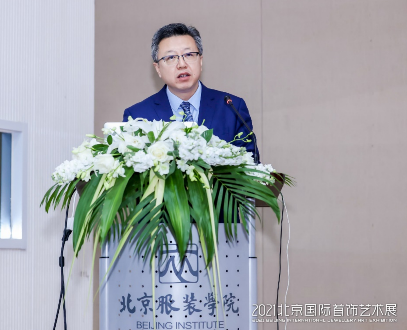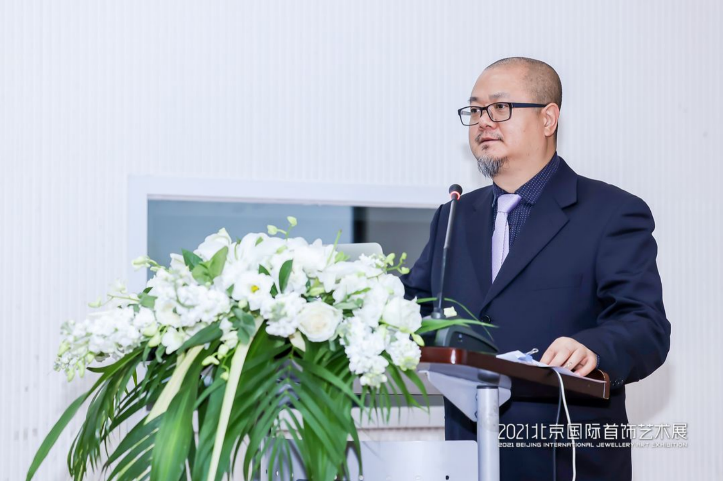 随后10位嘉宾进行了精彩演讲。北京服装学院珠宝首饰设计专业主任高伟发表了《赋彩生活、赋能产业—-2021北京国际首饰艺术展》的演讲。他说:“赋彩生活、赋能产业,是一个非常有意义的话题,从2013年举办第一届北京国际首饰艺术展的时候,就已经形成。这些年一直在延续,从珠宝首饰教学,到科研实践创作,都在不断践行。