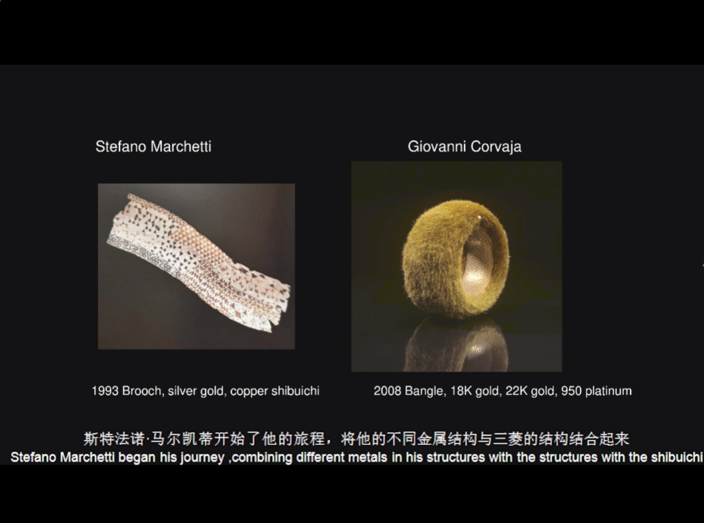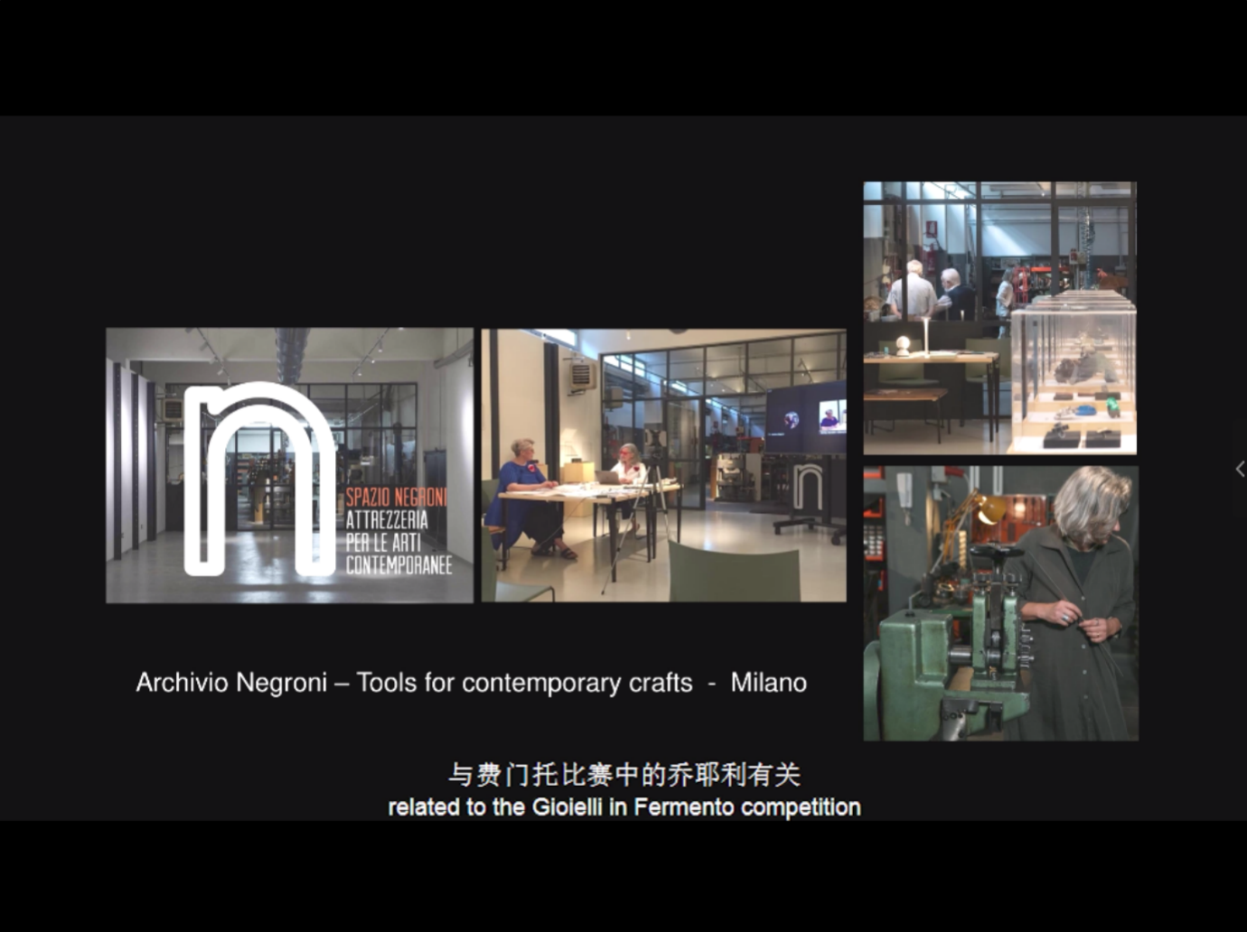 意大利帕多瓦Pietro Selvatico艺术学院教授Maria Rosa Franzin远程视频介绍了她所在的学院珠宝首饰艺术设计的概况。就珠宝首饰设计提出了两个新的定义:用于设计的珠宝和用于研究的珠宝。