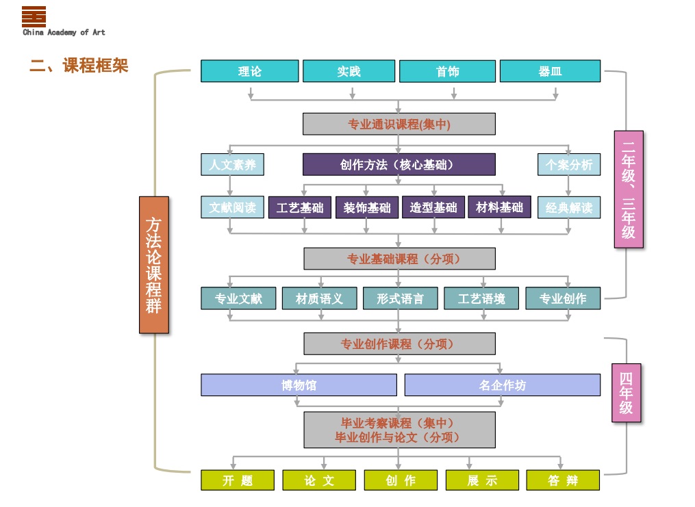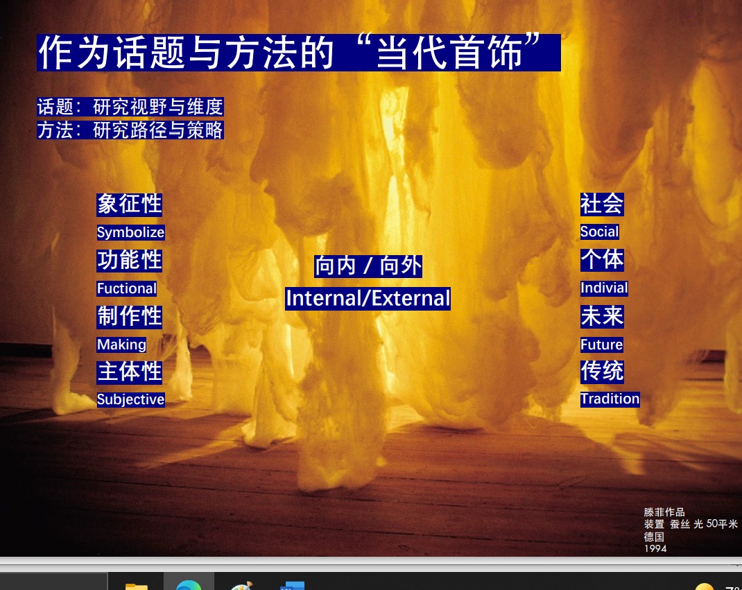 中国美术学院手工艺术学院首饰方向负责人段燕俪发表了《基于方法论课程群的首饰艺术设计专业本科培养模式的建构与实践》的报告。她提到中国正处于“十三五”规划提出的“中国传统工艺振兴时期”以及在此背景下中国美术学院首饰专业本科的教学体系,从思想理念、教学方法、培养模式、研究构架等方面分享了“四横三纵”的研究方法体系。