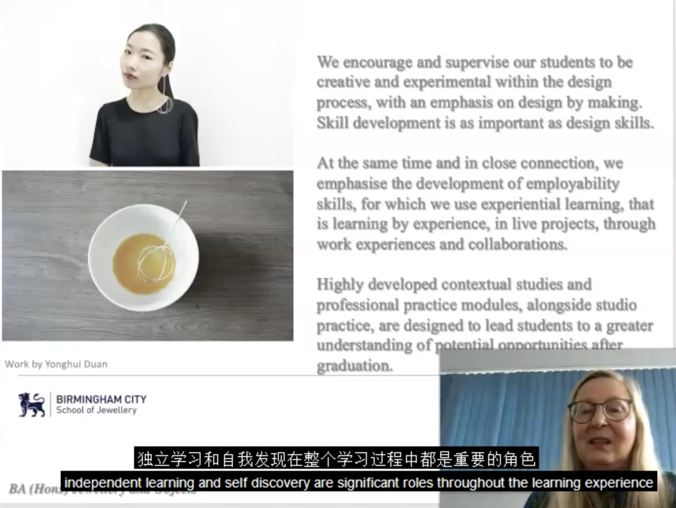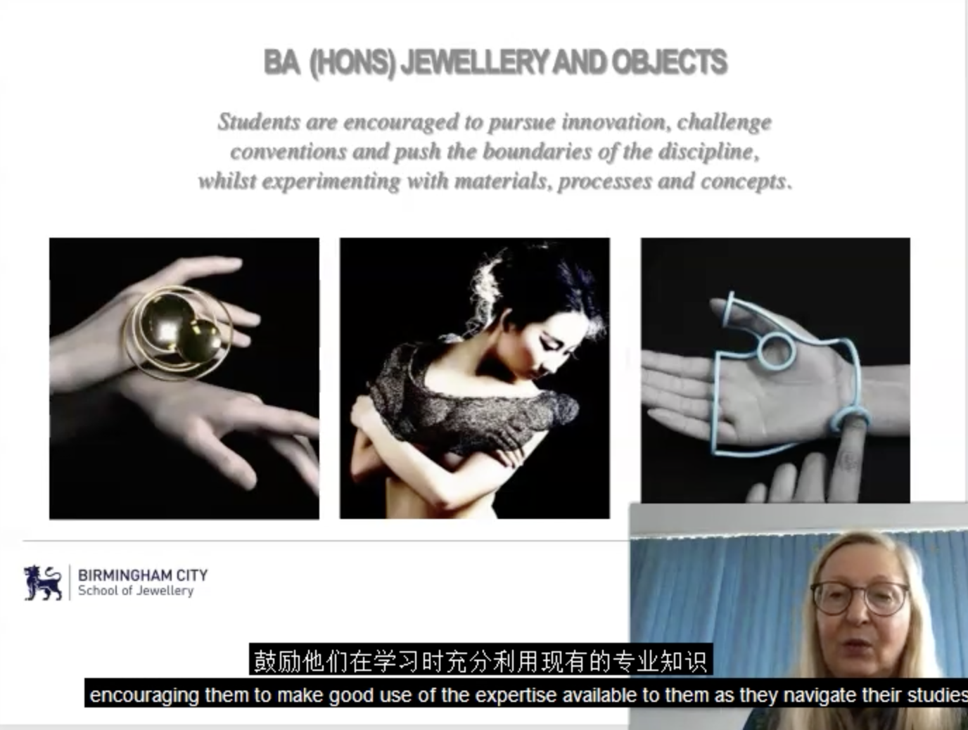 首先,英国伯明翰城市大学珠宝学院Jivan Astfalck(吉万.阿斯特法尔克)教授通过网络视频的方式和大家分享了关于伯明翰城市大学珠宝学院的教学理念,呈现了以拓展思维与批判意识为主体的西方当代首饰教学观,分享了以创新为基础的多元化的课程成果。