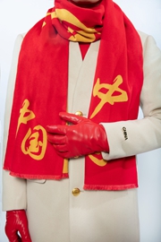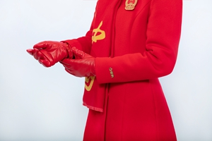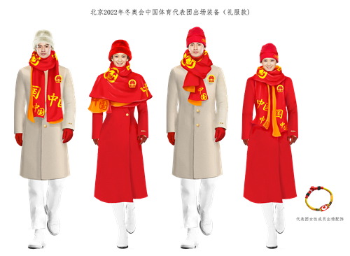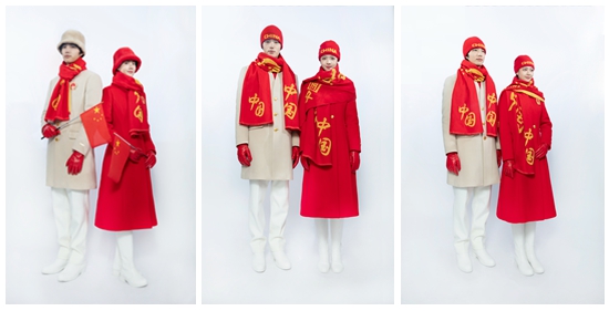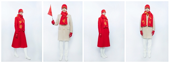 “中国风采”服装形制以简约为主,中式服装元素结合西式服装剪裁方法,整体兼具东方文化韵味与结构科学美感,展现运动员的健康体态。在整体搭配中,女运动员服装采用红色大衣搭配白色高筒靴,突出柔美婉约、优雅知性的形象;男运动员服装采用时尚米白色大衣配白色西裤、短靴,表现时尚儒雅、青春勃发的气质。男女运动员均搭配时尚保暖的围巾、帽子和手套,其中围巾以自由佩戴方式设计,达到同一条围巾的不同时尚风格。围巾以国旗红和国旗黄为主色,以隶书、楷书、行书三种书法字体织出“中国”二字,隶书的古朴庄重、楷书的方正不拘、行书的生动婉转,一点一划、一撇一捺之中,书写出和谐平衡的韵律之美,传递了中国文化,展示了东方文明的美好。