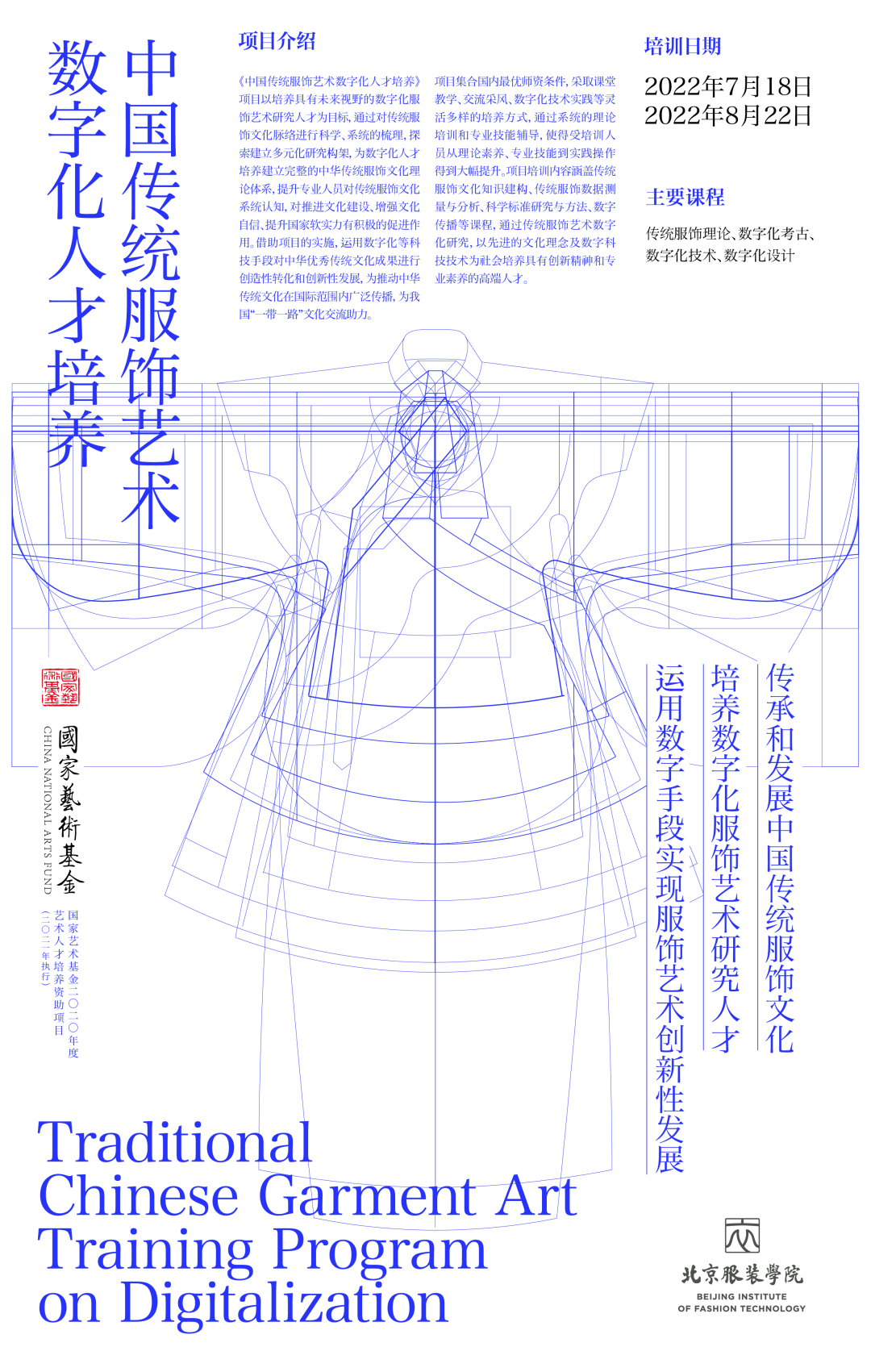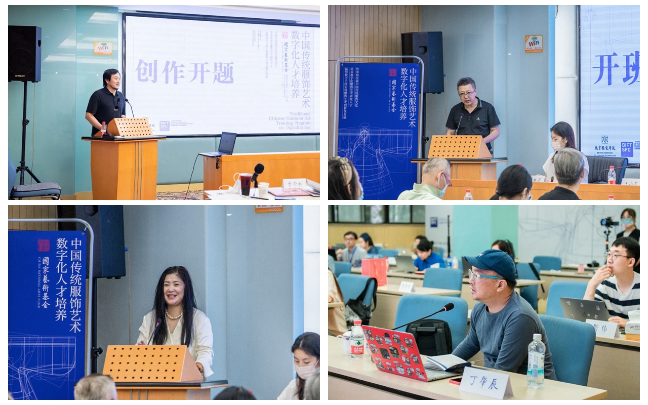 《中国传统服饰艺术数字化人才培养》项目于2020年获批国家艺术基金艺术人才培养资助。2022年7月至8月,来自全国18个省市的20名高校教师、博物馆研究人员及服装服饰专业领域的青年学者齐聚北京服装学院,完成了为期34天的集中理论学习、实践考察、交流研讨,并持续开展课题研究创作。