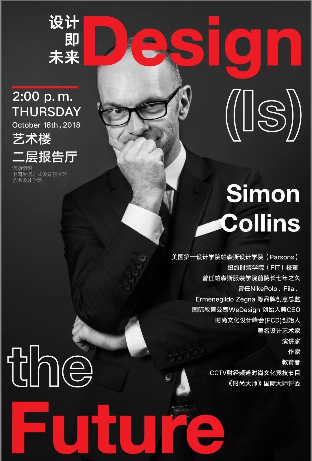 Simon Collins 美国第一设计学院帕森斯(Parsons)设计学院/纽约时装学院(FIT)校董,曾任帕森斯服装学院院长七年之久,曾任NikePolo、Fila和Ermenegildo Zegna等品牌创意总监,国际教育公司WeDesign 创始人兼CEO,时尚文化设计峰会(FCD)创始人,著名设计艺术家,演讲家,作家,教育者,CCTV财经频道时尚文化竞技节目《时尚大师》国际大师评委。