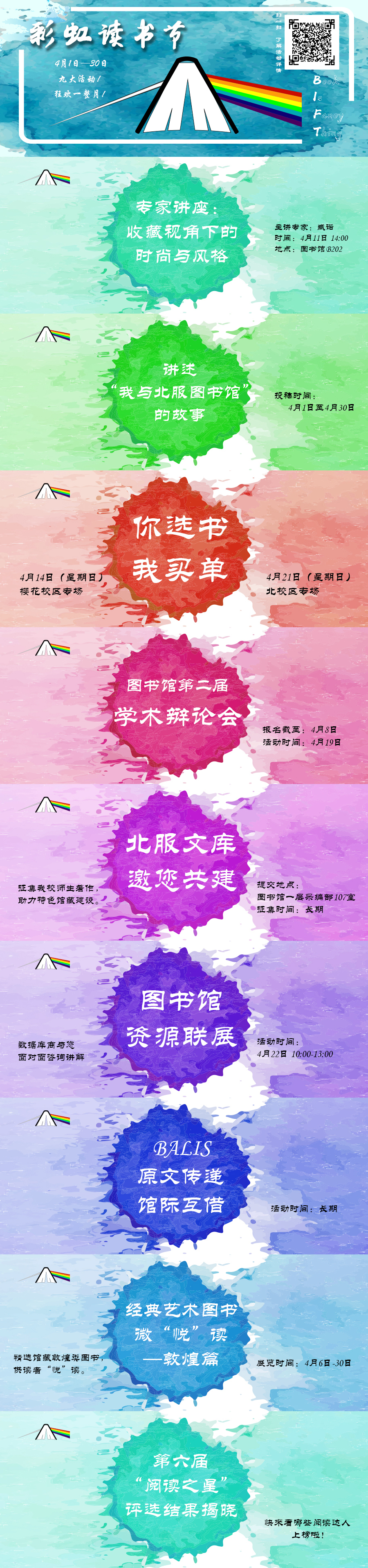 北服图书馆2019“彩虹读书节”九大活动随春风而来,让我们共同狂欢整个四月!