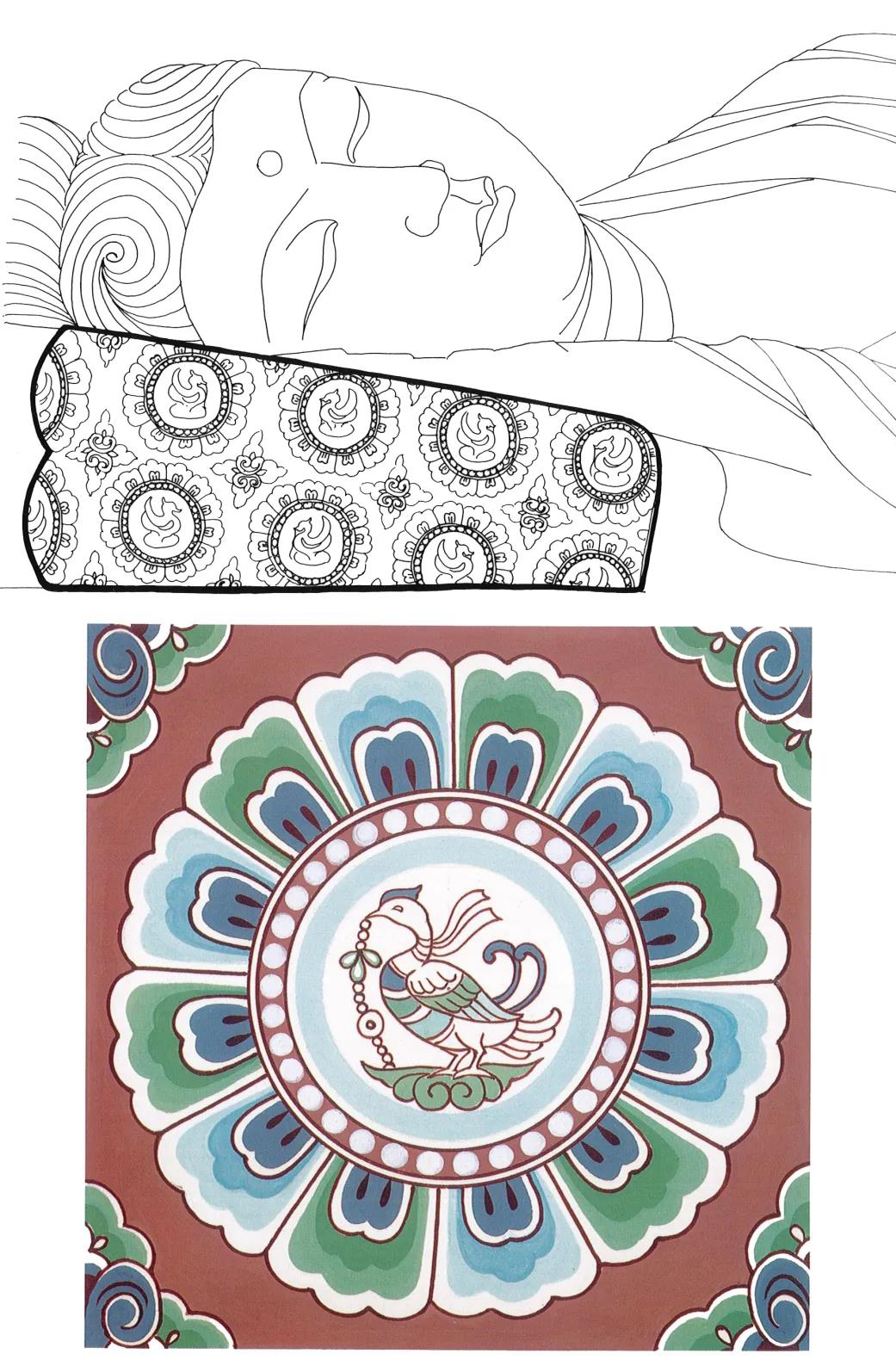 ▲设计灵感来源:敦煌莫高窟 中唐 第158窟 卧佛枕头印花图案(常沙娜 整理)