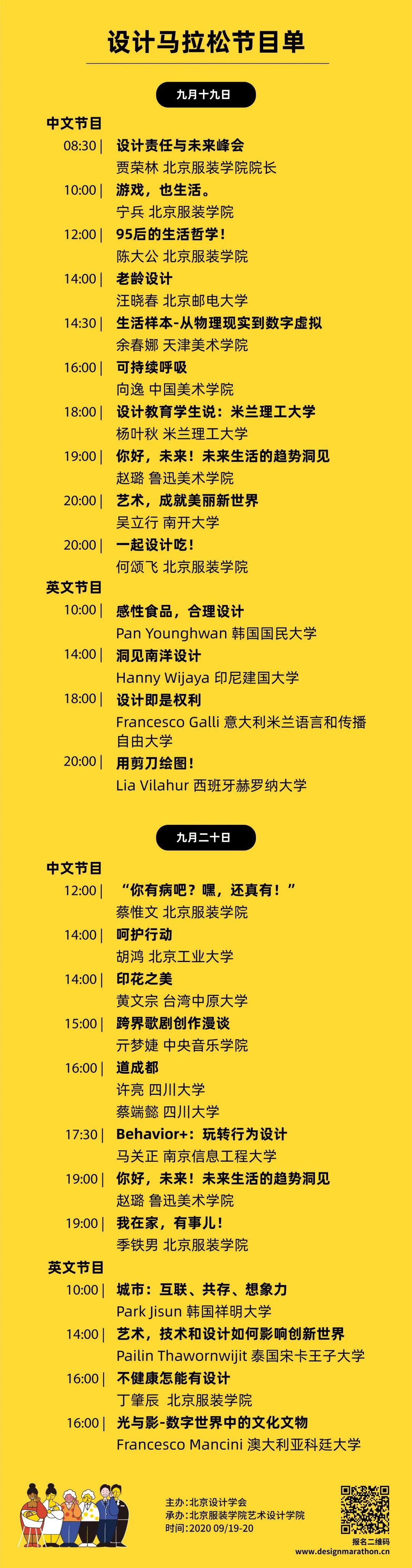 设计马拉松由北京设计学会与北京服装学院共同发起,2020年首度转换为线上活动,推出短平快的知识直播节目。希望和青年学者们共同探讨挖掘线上生活的福祉,一起开拓设计思维、探索青年文化,加入一场艺术与设计的赛博旅途。