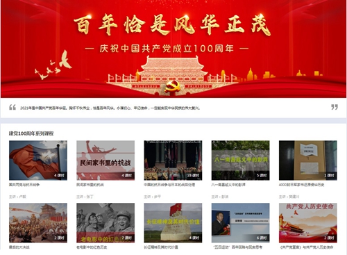 《网上报告厅》建党百年专题第一期《百年恰是风华正茂》系列课程,重温百年党史,踏寻红色印记,续谱时代华章。畅想之星《党史党政数据库》,收录1957年以来出版的1万余种党史党政类学术电子书,百余部高清音、视频专题纪录片。神州共享《建党百年红色故事绘》,用1000册连环画浓缩展现党的100年。QQ阅读《新时代 新经典》专栏,习近平总书记著作、讲话单行本,及权威部门等编写的论述摘编、学习读本、思想研究、用语解读等近200种电子图书。以上资源均可通过图书馆公众号菜单—资源—电子资源访问。