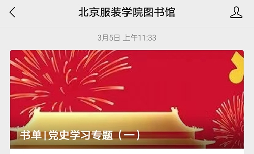 图书馆自3月初开始通过公众号平台“书单”“开卷有易”等专栏相继推出党史学习教育专题内容,今后还将陆续开展以“党史学习”为主题的红色经典图书图片展、诵读比赛、红色经典引读、京城党史文化之旅等形式多样的阅读推广活动,期待我校师生积极参与,在红色书香中共庆建党百年。
