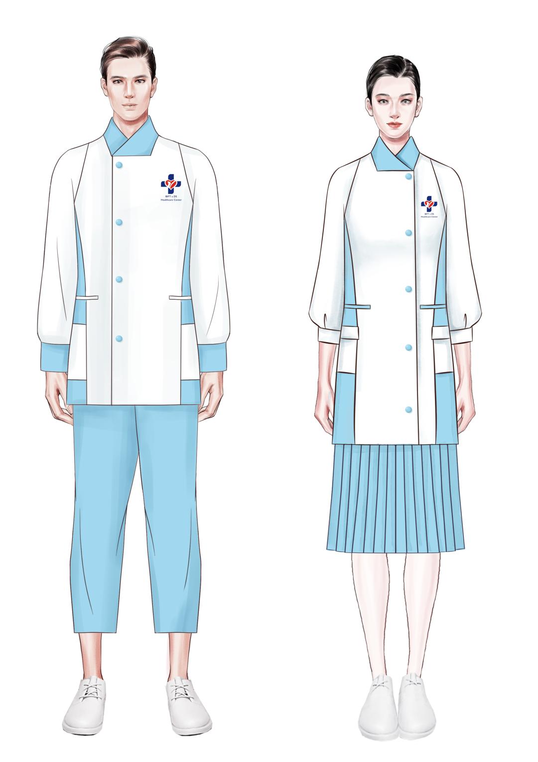 款式设计上以简洁、大方、便于活动为宗旨,同时融入立领、小翻领、局部镶边等设计,使医护服装在整体端庄严肃的氛围下又不失活泼轻松的感觉,体现出既神圣高洁又温柔可亲的医护工作者形象。