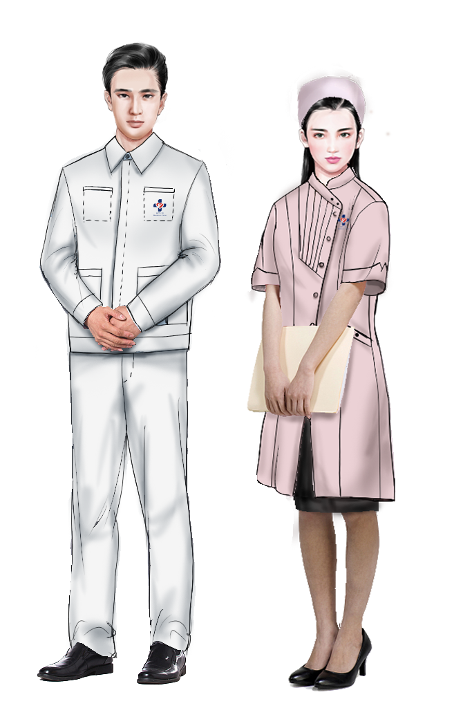 款式上服装整体以实用性为基准出发点,再加之凸显美学的细节。男女医生服装加入中式立领元素,区别于传统领型,体现中国特色。护士服装款式采用非对称结构,能够在较严肃的环境中增加活跃气氛;病号服装,以人为本,充分考虑到各类病人的不同需求以及穿脱的便捷性,合理进行结构设计。