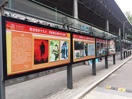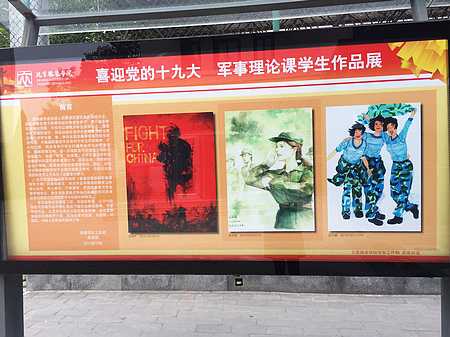 北京服装学院武装部为迎接党的十九大胜利召开,结合《普通高等学校军事课教学大纲》的通知要求,由党委学工部、武装部策划,从2016级学生几百幅作品中精心挑选出79幅作品,以画板形式展出。展览是对学生再一次的国防保障教育,使学生树立以中华民族伟大复兴为己任,为实现中国梦、强军梦而不懈努力的信念。尽管有的作品还不够成熟,但每一幅都饱含着对祖国、对国防、对部队、对战士的赞美和热爱之情。