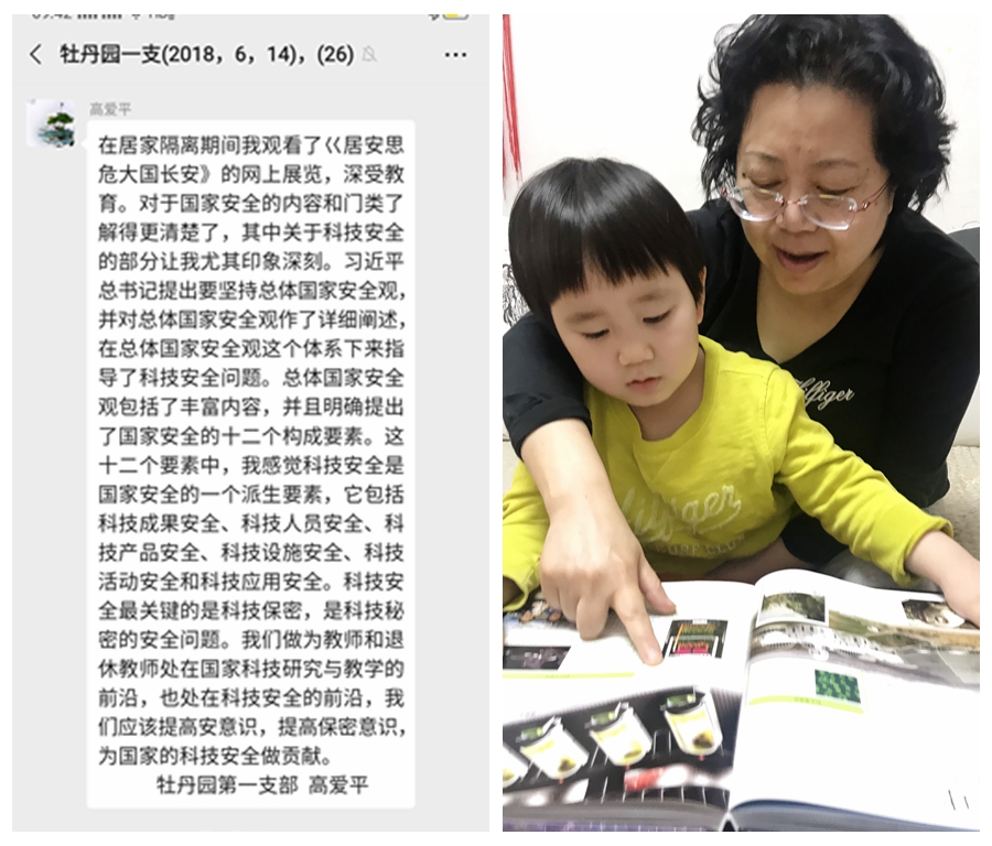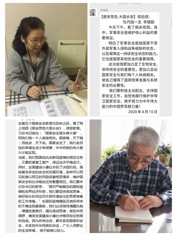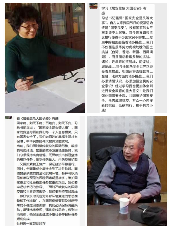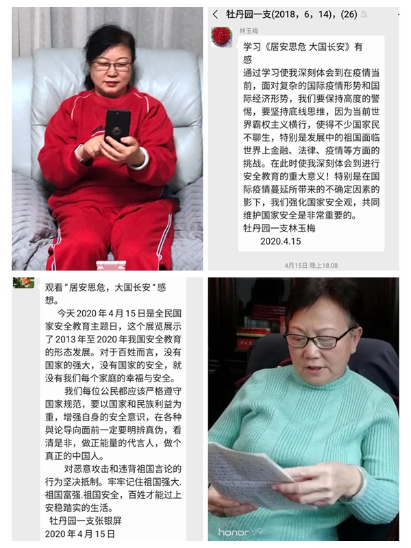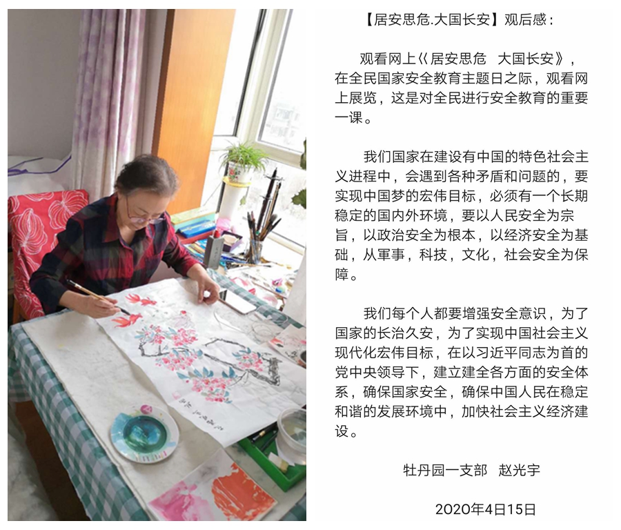 在第五个全民国家安全教育日之际,按照离退休党委的统一安排,牡丹园第一党支部组织支部全体党员和属地群众参观了《居安思危 大国长安》——2020年4·15全民国家安全教育日线上主题展览,开展了以“做国家安全的维护者”为主题的党日活动。