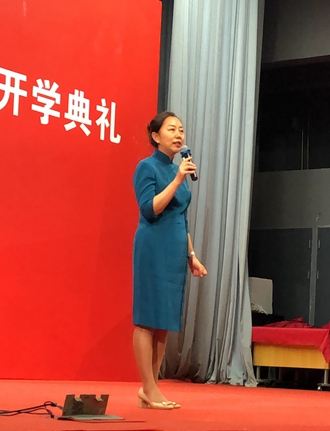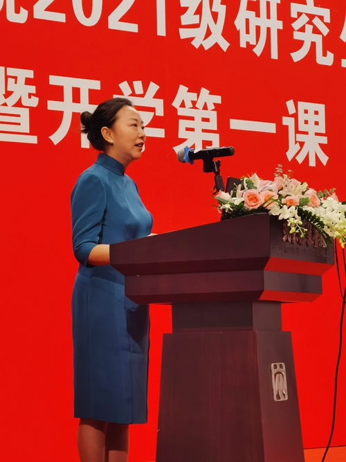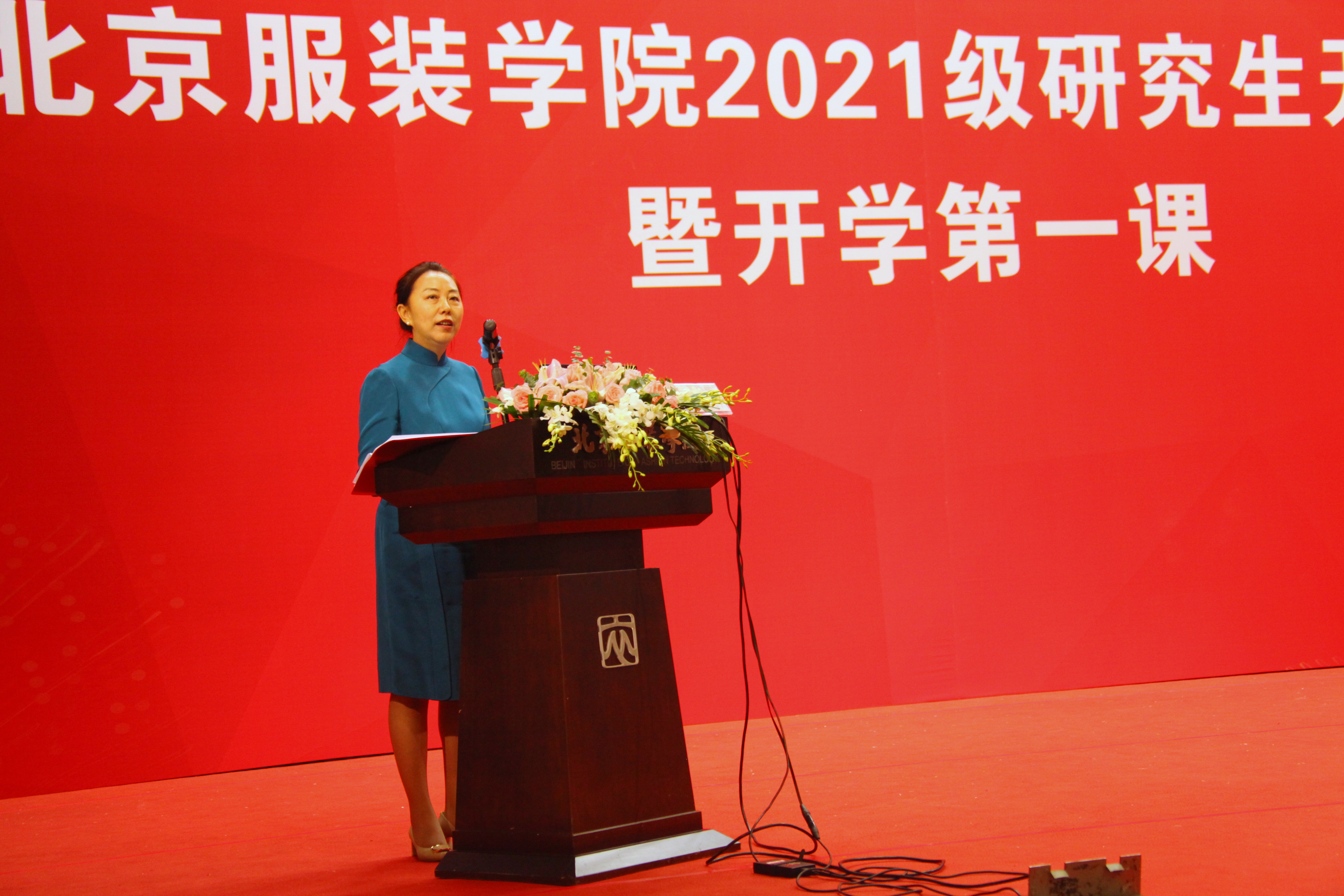 周志军首先代表学校全体师生,向2021级研究生新同学的到来表示最热烈的欢迎。她用了一组数据开场,她说:在座的460名同学,其中80%是女生,25%本科就在北服就读。同学们分别来自全国214所高校,从五湖四海走到一起。希望大家在研究生阶段,比本科生阶段有更宽的视野和更高的格局,认真思考在未来两年半的学术研究和美好生活的岁月,如何能够成为更好的自己。