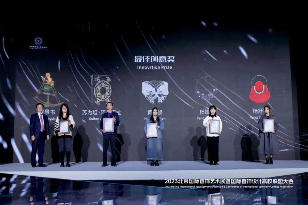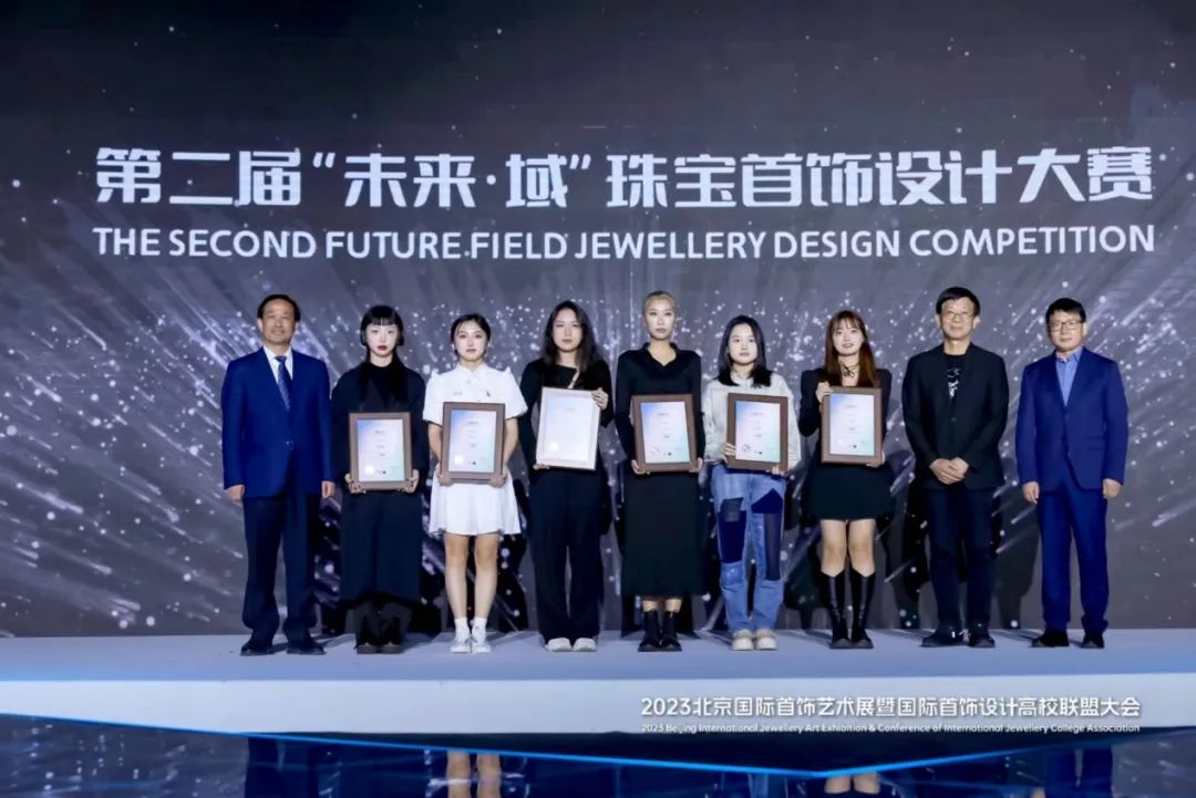 同期举行了“未来·域”首饰设计全球竞赛及颁奖礼。大赛是由国际首饰设计高校联盟主办的年度重点赛事,本届紧扣“未来”主题,评审委员会根据概念的先锋性、视觉的创新性、工艺的完成度,围绕未来价值、社会价值、市场应用等进行讨论评选,最终评选出获奖作品(获奖名单见下图)。北京服装学院党委副书记倪赛力,党委常委、副院长詹炳宏,第三届国际首饰设计联盟主席王敏,百泰集团创始人周桃林为获奖代表颁发证书和奖杯。