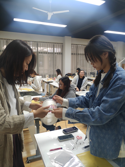 同学们专心致志的投入到花草灯的制作中