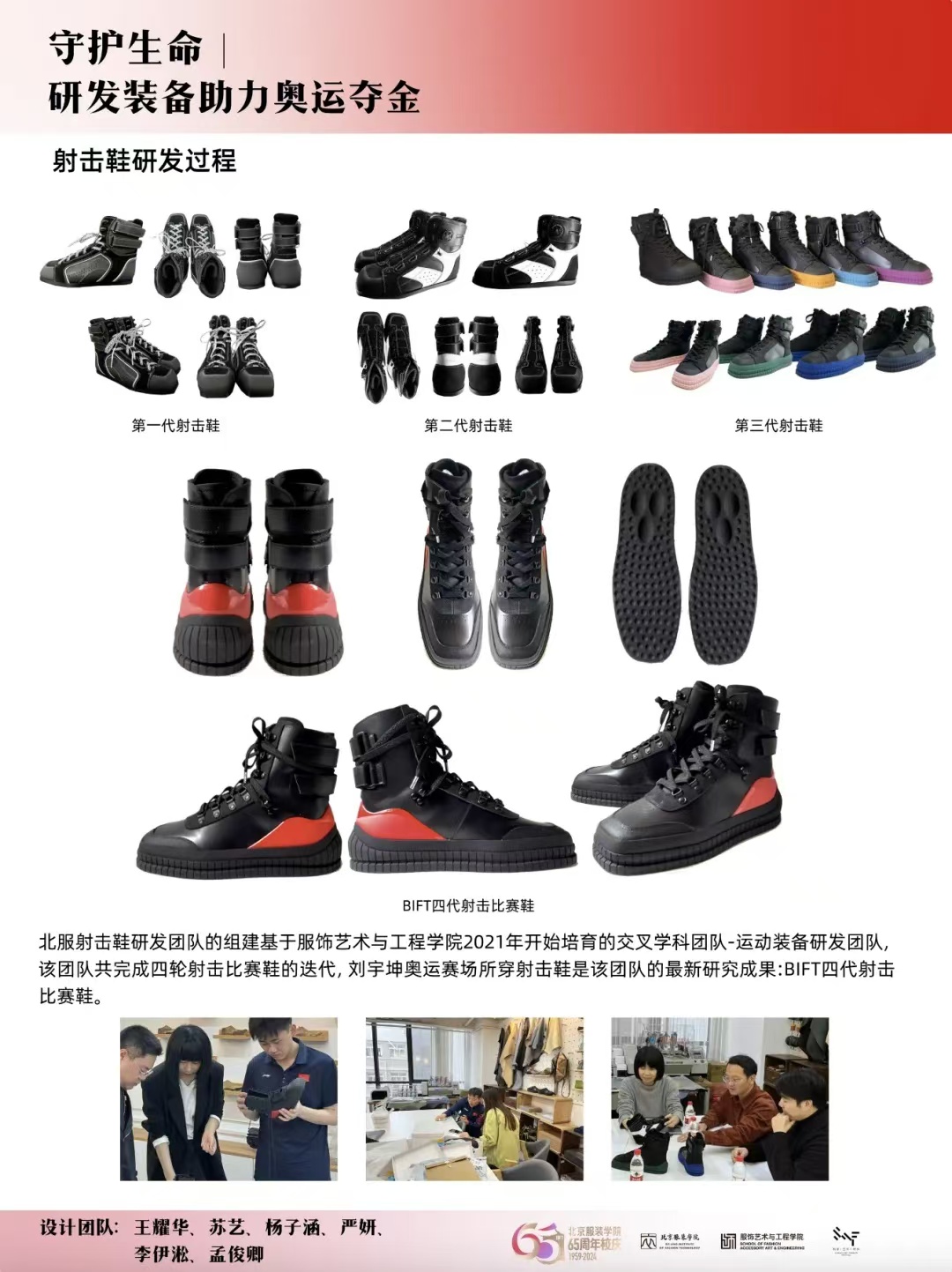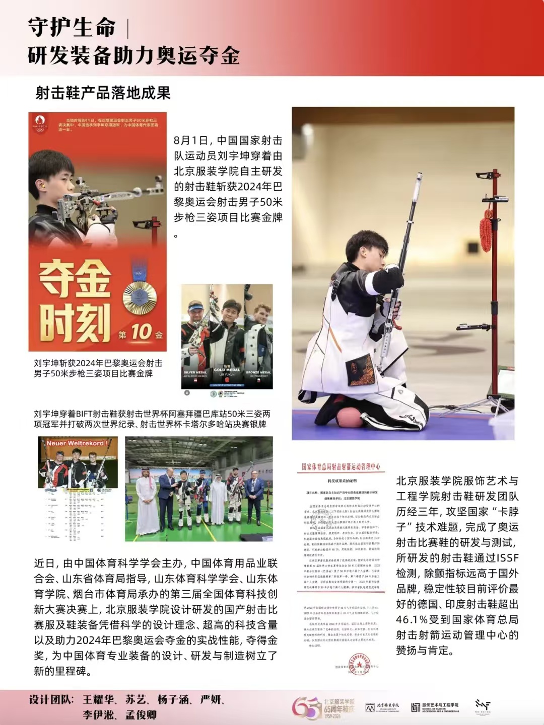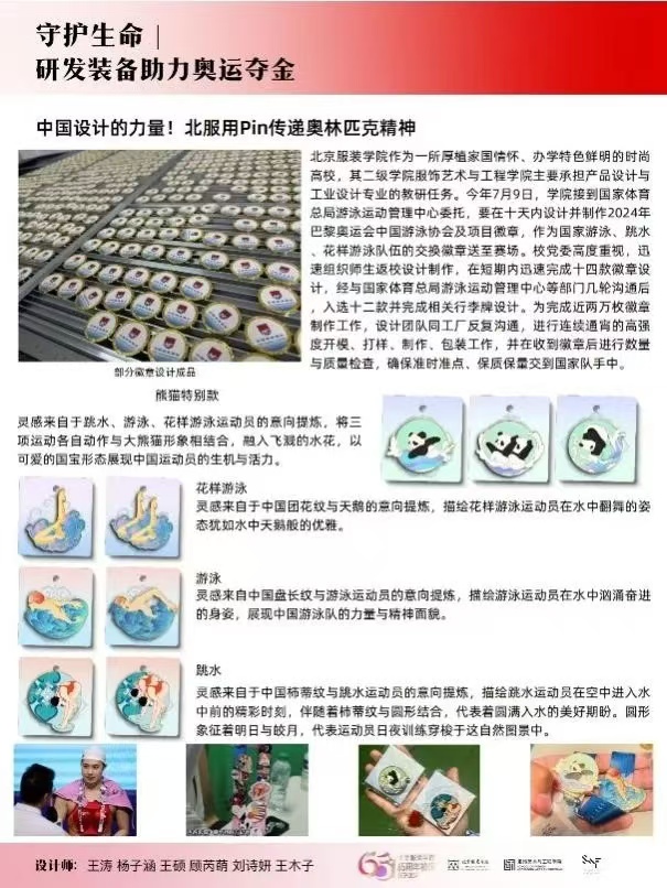 服饰艺术与工程学院射击鞋研发团队由党员师生组成,团队攻坚克难,实现国产射击鞋“卡脖子”问题,射击鞋除颤指标较国外品牌提升46.1%,大大提高运动员重心稳定性和舒适性,助力中国射击队运动员刘宇坤夺得2024年巴黎奥运会射击男子50米步枪三姿项目比赛金牌。此外,刘宇坤在比赛中使用的枪衣也由学院研发,助力国家运动员形象提升,向世界传递中国的时尚设计理念和对产品的高品质追求。学院还接到国家体育总局游泳运动管理中心委托,需要在十天内设计并制作2024年巴黎奥运会中国游泳协会及项目徽章,作为国家游泳、跳水、花样游泳队伍的交换徽章送至赛场。由党员师生迅速组队的设计团队完成十二款徽章和行李牌设计通过审核后,为完成近两万枚徽章制作,设计团队连续通宵高强度推进开模、打样等工作,最终确保准时准点、保质保量交到国家队手中,交换徽章跟随中国代表团将奥林匹克文化与精神传播到世界各地。