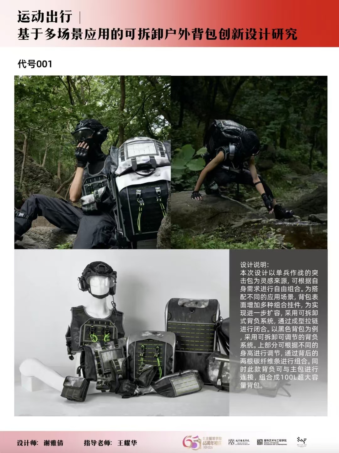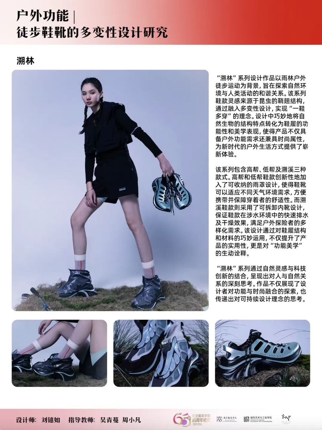 学院始终坚持“为人民而设计”,师生在面向户外活动、应急救援多场景应用下,研发各类适用的鞋品箱包。代表性成果包括背负式救援背囊、户外徒步鞋靴等。